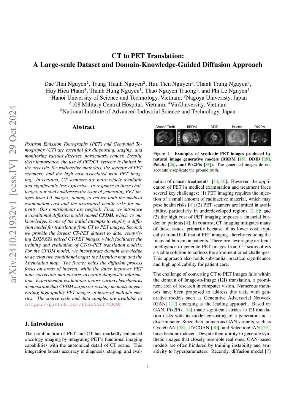 Positron Emission Tomography (PET) and Computed Tomography (CT) are essential for diagnosing, staging, and monitoring various diseases, particularly cancer. Despite their importance, the use of PET/CT systems is limited by the necessity for radioactive materials, the scarcity of PET scanners, and the high cost associated with PET imaging. In contrast, CT scanners are more widely available and significantly less expensive. In response to these challenges, our study addresses the issue of generating PET images from CT images, aiming to reduce both the medical examination cost and the associated health risks for patients. Our contributions are twofold: First, we introduce a conditional diffusion model named CPDM, which, to our knowledge, is one of the initial attempts to employ a diffusion model for translating from CT to PET images. Second, we provide the largest CT-PET dataset to date, comprising 2,028,628 paired CT-PET images, which facilitates the training and evaluation of CT-to-PET translation models. For the CPDM model, we incorporate domain knowledge to develop two conditional maps: the Attention map and the Attenuation map. The former helps the diffusion process focus on areas of interest, while the latter improves PET data correction and ensures accurate diagnostic information. Experimental evaluations across various benchmarks demonstrate that CPDM surpasses existing methods in generating high-quality PET images in terms of multiple metrics. The source code and data samples are available at https://github.com/thanhhff/CPDM.