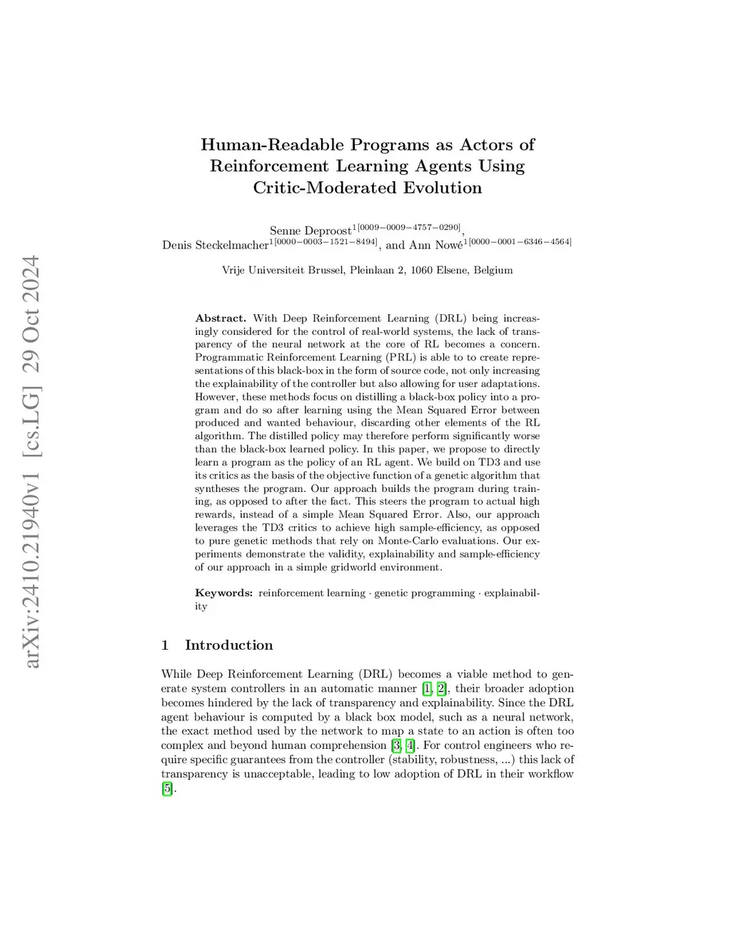 With Deep Reinforcement Learning (DRL) being increasingly considered for the control of real-world systems, the lack of transparency of the neural network at the core of RL becomes a concern. Programmatic Reinforcement Learning (PRL) is able to to create representations of this black-box in the form of source code, not only increasing the explainability of the controller but also allowing for user adaptations. However, these methods focus on distilling a black-box policy into a program and do so after learning using the Mean Squared Error between produced and wanted behaviour, discarding other elements of the RL algorithm. The distilled policy may therefore perform significantly worse than the black-box learned policy. In this paper, we propose to directly learn a program as the policy of an RL agent. We build on TD3 and use its critics as the basis of the objective function of a genetic algorithm that syntheses the program. Our approach builds the program during training, as opposed to after the fact. This steers the program to actual high rewards, instead of a simple Mean Squared Error. Also, our approach leverages the TD3 critics to achieve high sample-efficiency, as opposed to pure genetic methods that rely on Monte-Carlo evaluations. Our experiments demonstrate the validity, explainability and sample-efficiency of our approach in a simple gridworld environment.