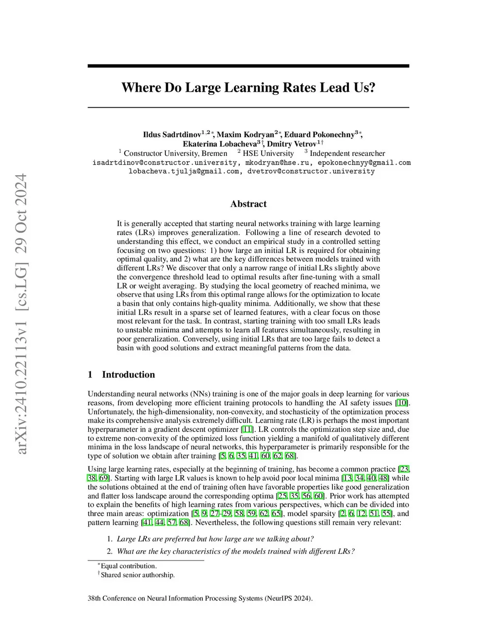 It is generally accepted that starting neural networks training with large learning rates (LRs) improves generalization. Following a line of research devoted to understanding this effect, we conduct an empirical study in a controlled setting focusing on two questions: 1) how large an initial LR is required for obtaining optimal quality, and 2) what are the key differences between models trained with different LRs? We discover that only a narrow range of initial LRs slightly above the convergence threshold lead to optimal results after fine-tuning with a small LR or weight averaging. By studying the local geometry of reached minima, we observe that using LRs from this optimal range allows for the optimization to locate a basin that only contains high-quality minima. Additionally, we show that these initial LRs result in a sparse set of learned features, with a clear focus on those most relevant for the task. In contrast, starting training with too small LRs leads to unstable minima and attempts to learn all features simultaneously, resulting in poor generalization. Conversely, using initial LRs that are too large fails to detect a basin with good solutions and extract meaningful patterns from the data.