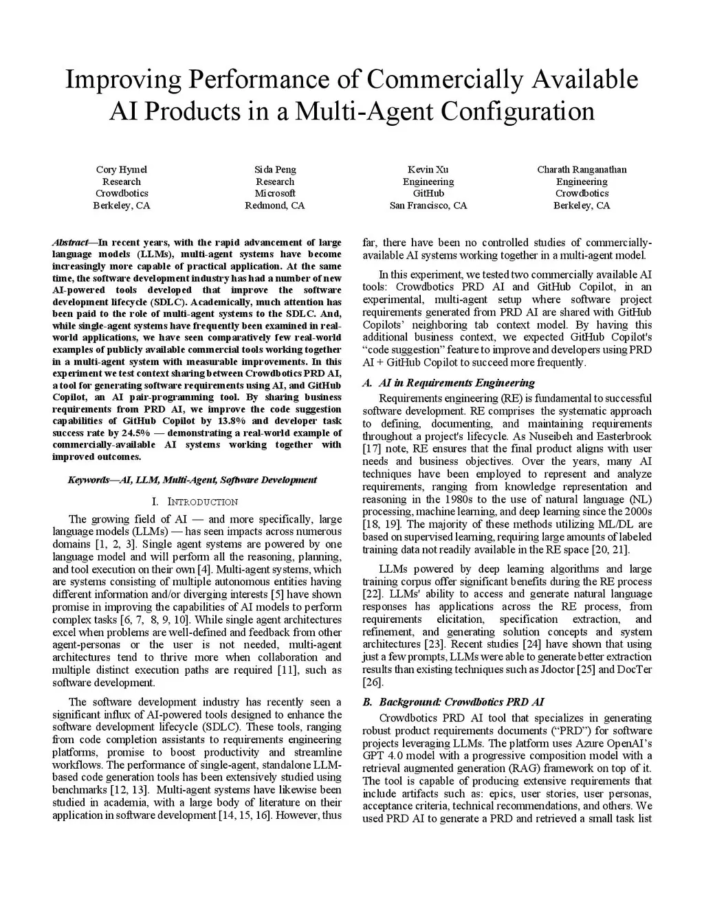 In recent years, with the rapid advancement of large language models (LLMs), multi-agent systems have become increasingly more capable of practical application. At the same time, the software development industry has had a number of new AI-powered tools developed that improve the software development lifecycle (SDLC). Academically, much attention has been paid to the role of multi-agent systems to the SDLC. And, while single-agent systems have frequently been examined in real-world applications, we have seen comparatively few real-world examples of publicly available commercial tools working together in a multi-agent system with measurable improvements. In this experiment we test context sharing between Crowdbotics PRD AI, a tool for generating software requirements using AI, and GitHub Copilot, an AI pair-programming tool. By sharing business requirements from PRD AI, we improve the code suggestion capabilities of GitHub Copilot by 13.8% and developer task success rate by 24.5% -- demonstrating a real-world example of commercially-available AI systems working together with improved outcomes.
