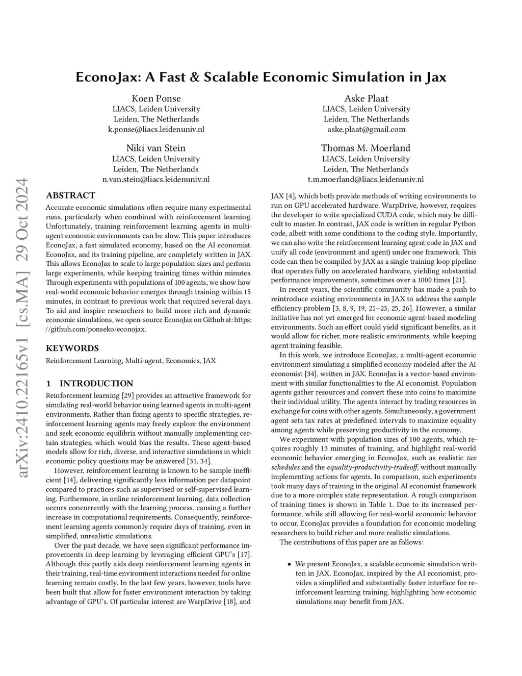 Accurate economic simulations often require many experimental runs, particularly when combined with reinforcement learning. Unfortunately, training reinforcement learning agents in multi-agent economic environments can be slow. This paper introduces EconoJax, a fast simulated economy, based on the AI economist. EconoJax, and its training pipeline, are completely written in JAX. This allows EconoJax to scale to large population sizes and perform large experiments, while keeping training times within minutes. Through experiments with populations of 100 agents, we show how real-world economic behavior emerges through training within 15 minutes, in contrast to previous work that required several days. We additionally perform experiments in varying sized action spaces to test if some multi-agent methods produce more diverse behavior compared to others. Here, our findings indicate no notable differences in produced behavior with different methods as is sometimes suggested in earlier works. To aid further research, we open-source EconoJax on Github.