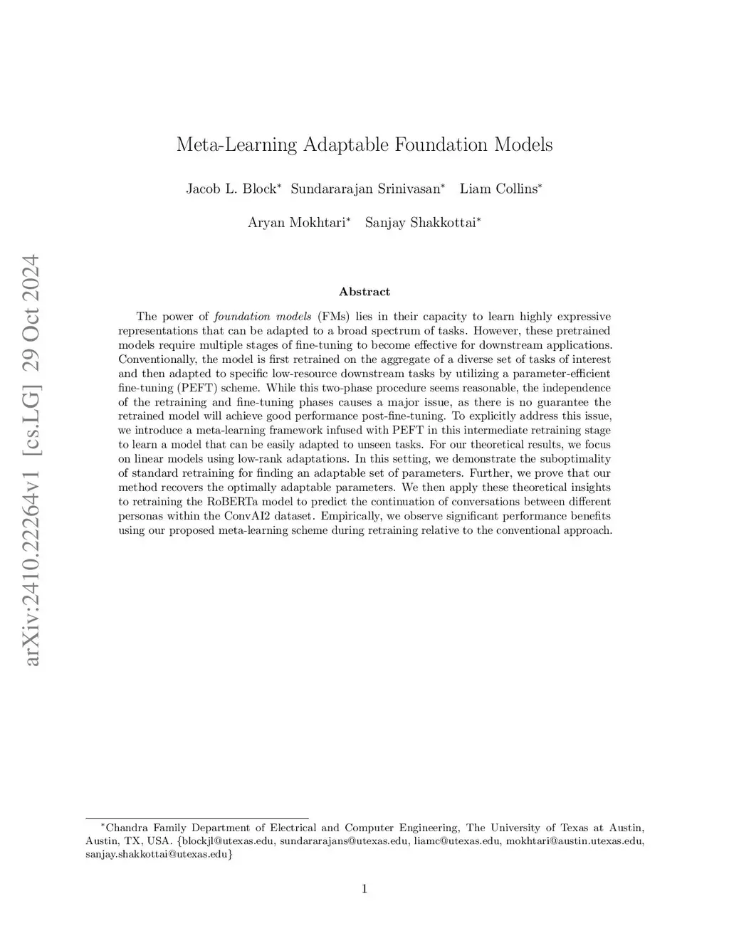 The power of foundation models (FMs) lies in their capacity to learn highly expressive representations that can be adapted to a broad spectrum of tasks. However, these pretrained models require additional training stages to become effective for downstream applications. In the multi-task setting, prior works have shown empirically that specific meta-learning approaches for preparing a model for future adaptation through parameter-efficient fine-tuning (PEFT) can outperform standard retraining methods, but the mechanism of the benefits of meta-learning has been largely unexplored. We introduce a framework for generic PEFT-based meta-learning to learn a model that can easily adapt to unseen tasks. For linear models using LoRA, we show that standard retraining is provably suboptimal for finding an adaptable set of parameters and provide strict performance guarantees for our proposed method. We verify these theoretical insights through experiments on synthetic data as well as real-data vision and language tasks. We observe significant performance benefits using a simple implementation of our proposed meta-learning scheme during retraining relative to the conventional approach.