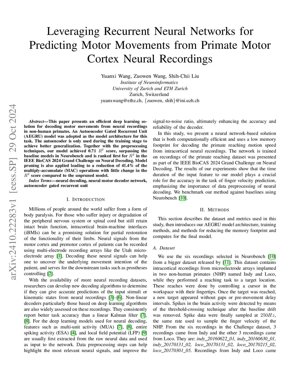 This paper presents an efficient deep learning solution for decoding motor movements from neural recordings in non-human primates. An Autoencoder Gated Recurrent Unit (AEGRU) model was adopted as the model architecture for this task. The autoencoder is only used during the training stage to achieve better generalization. Together with the preprocessing techniques, our model achieved 0.71 score, surpassing the baseline models in Neurobench and is ranked first for in the IEEE BioCAS 2024 Grand Challenge on Neural Decoding. Model pruning is also applied leading to a reduction of 41.4% of the multiply-accumulate (MAC) operations with little change in the score compared to the unpruned model.