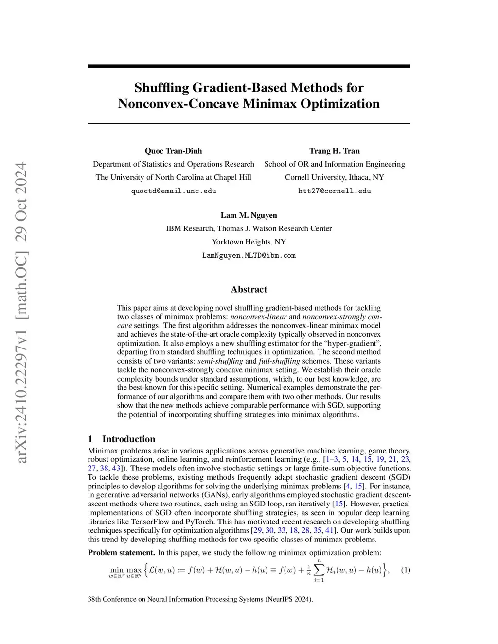 This paper aims at developing novel shuffling gradient-based methods for tackling two classes of minimax problems: nonconvex-linear and nonconvex-strongly concave settings. The first algorithm addresses the nonconvex-linear minimax model and achieves the state-of-the-art oracle complexity typically observed in nonconvex optimization. It also employs a new shuffling estimator for the "hyper-gradient", departing from standard shuffling techniques in optimization. The second method consists of two variants: semi-shuffling and full-shuffling schemes. These variants tackle the nonconvex-strongly concave minimax setting. We establish their oracle complexity bounds under standard assumptions, which, to our best knowledge, are the best-known for this specific setting. Numerical examples demonstrate the performance of our algorithms and compare them with two other methods. Our results show that the new methods achieve comparable performance with SGD, supporting the potential of incorporating shuffling strategies into minimax algorithms.