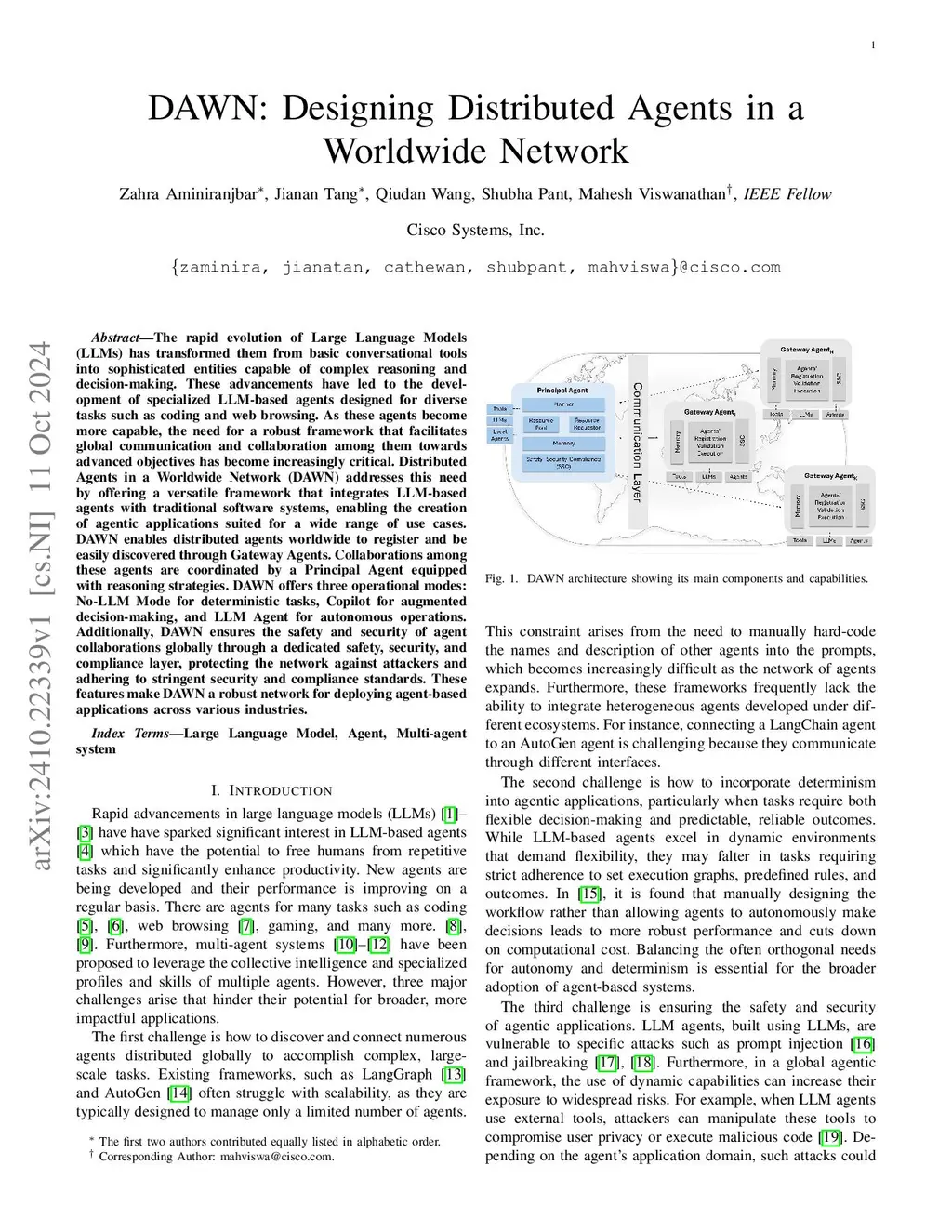 The rapid evolution of Large Language Models (LLMs) has transformed them from basic conversational tools into sophisticated entities capable of complex reasoning and decision-making. These advancements have led to the development of specialized LLM-based agents designed for diverse tasks such as coding and web browsing. As these agents become more capable, the need for a robust framework that facilitates global communication and collaboration among them towards advanced objectives has become increasingly critical. Distributed Agents in a Worldwide Network (DAWN) addresses this need by offering a versatile framework that integrates LLM-based agents with traditional software systems, enabling the creation of agentic applications suited for a wide range of use cases. DAWN enables distributed agents worldwide to register and be easily discovered through Gateway Agents. Collaborations among these agents are coordinated by a Principal Agent equipped with reasoning strategies. DAWN offers three operational modes: No-LLM Mode for deterministic tasks, Copilot for augmented decision-making, and LLM Agent for autonomous operations. Additionally, DAWN ensures the safety and security of agent collaborations globally through a dedicated safety, security, and compliance layer, protecting the network against attackers and adhering to stringent security and compliance standards. These features make DAWN a robust network for deploying agent-based applications across various industries.