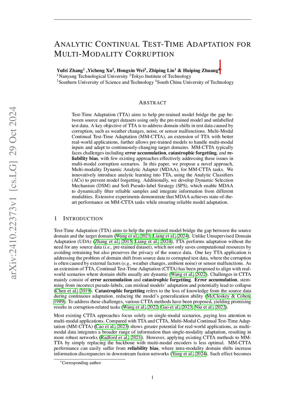 Test-Time Adaptation (TTA) enables pre-trained models to bridge the gap between source and target datasets using unlabeled test data, addressing domain shifts caused by corruptions like weather changes, noise, or sensor malfunctions in test time. Multi-Modal Continual Test-Time Adaptation (MM-CTTA), as an extension of standard TTA, further allows models to handle multi-modal inputs and adapt to continuously evolving target domains. However, MM-CTTA faces critical challenges such as catastrophic forgetting and reliability bias, which are rarely addressed effectively under multi-modal corruption scenarios. In this paper, we propose a novel approach, Multi-modality Dynamic Analytic Adapter (MDAA), to tackle MM-CTTA tasks. MDAA introduces analytic learning,a closed-form training technique,through Analytic Classifiers (ACs) to mitigate catastrophic forgetting. Furthermore, we design the Dynamic Late Fusion Mechanism (DLFM) to dynamically select and integrate reliable information from different modalities. Extensive experiments show that MDAA achieves state-of-the-art performance across the proposed tasks.
