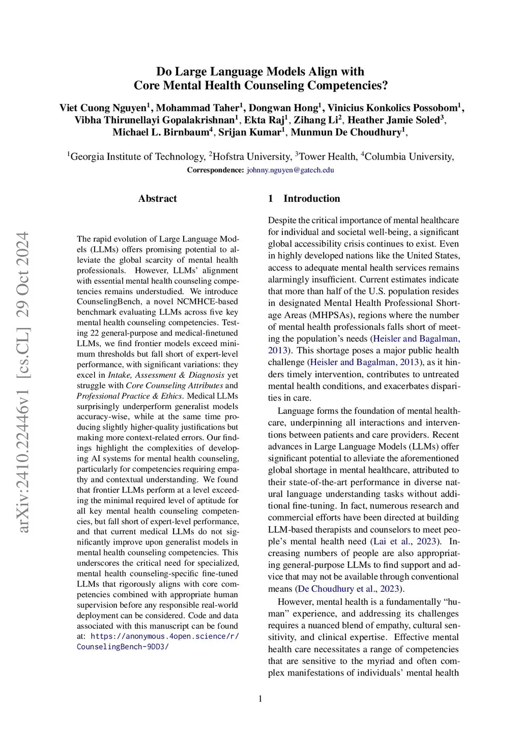 The rapid evolution of Large Language Models (LLMs) presents a promising solution to the global shortage of mental health professionals. However, their alignment with essential counseling competencies remains underexplored. We introduce CounselingBench, a novel NCMHCE-based benchmark evaluating 22 general-purpose and medical-finetuned LLMs across five key competencies. While frontier models surpass minimum aptitude thresholds, they fall short of expert-level performance, excelling in Intake, Assessment & Diagnosis but struggling with Core Counseling Attributes and Professional Practice & Ethics. Surprisingly, medical LLMs do not outperform generalist models in accuracy, though they provide slightly better justifications while making more context-related errors. These findings highlight the challenges of developing AI for mental health counseling, particularly in competencies requiring empathy and nuanced reasoning. Our results underscore the need for specialized, fine-tuned models aligned with core mental health counseling competencies and supported by human oversight before real-world deployment. Code and data associated with this manuscript can be found at:this https URL