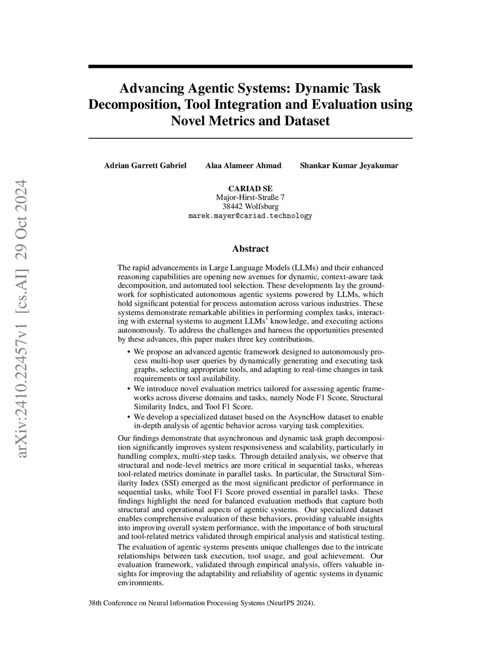 Advancements in Large Language Models (LLMs) are revolutionizing the development of autonomous agentic systems by enabling dynamic, context-aware task decomposition and automated tool selection. These sophisticated systems possess significant automation potential across various industries, managing complex tasks, interacting with external systems to enhance knowledge, and executing actions independently. This paper presents three primary contributions to advance this field: - Advanced Agentic Framework: A system that handles multi-hop queries, generates and executes task graphs, selects appropriate tools, and adapts to real-time changes. - Novel Evaluation Metrics: Introduction of Node F1 Score, Structural Similarity Index (SSI), and Tool F1 Score to comprehensively assess agentic systems. - Specialized Dataset: Development of an AsyncHow-based dataset for analyzing agent behavior across different task complexities. Our findings reveal that asynchronous and dynamic task graph decomposition significantly enhances system responsiveness and scalability, particularly for complex, multi-step tasks. Detailed analysis shows that structural and node-level metrics are crucial for sequential tasks, while tool-related metrics are more important for parallel tasks. Specifically, the Structural Similarity Index (SSI) is the most significant predictor of performance in sequential tasks, and the Tool F1 Score is essential for parallel tasks. These insights highlight the need for balanced evaluation methods that capture both structural and operational dimensions of agentic systems. Additionally, our evaluation framework, validated through empirical analysis and statistical testing, provides valuable insights for improving the adaptability and reliability of agentic systems in dynamic environments.