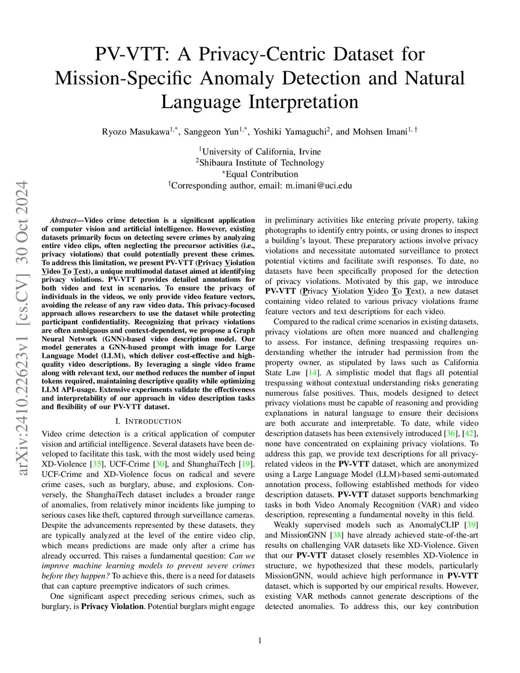 Video crime detection is a significant application of computer vision and artificial intelligence. However, existing datasets primarily focus on detecting severe crimes by analyzing entire video clips, often neglecting the precursor activities (i.e., privacy violations) that could potentially prevent these crimes. To address this limitation, we present PV-VTT (Privacy Violation Video To Text), a unique multimodal dataset aimed at identifying privacy violations. PV-VTT provides detailed annotations for both video and text in scenarios. To ensure the privacy of individuals in the videos, we only provide video feature vectors, avoiding the release of any raw video data. This privacy-focused approach allows researchers to use the dataset while protecting participant confidentiality. Recognizing that privacy violations are often ambiguous and context-dependent, we propose a Graph Neural Network (GNN)-based video description model. Our model generates a GNN-based prompt with image for Large Language Model (LLM), which deliver cost-effective and high-quality video descriptions. By leveraging a single video frame along with relevant text, our method reduces the number of input tokens required, maintaining descriptive quality while optimizing LLM API-usage. Extensive experiments validate the effectiveness and interpretability of our approach in video description tasks and flexibility of our PV-VTT dataset.
