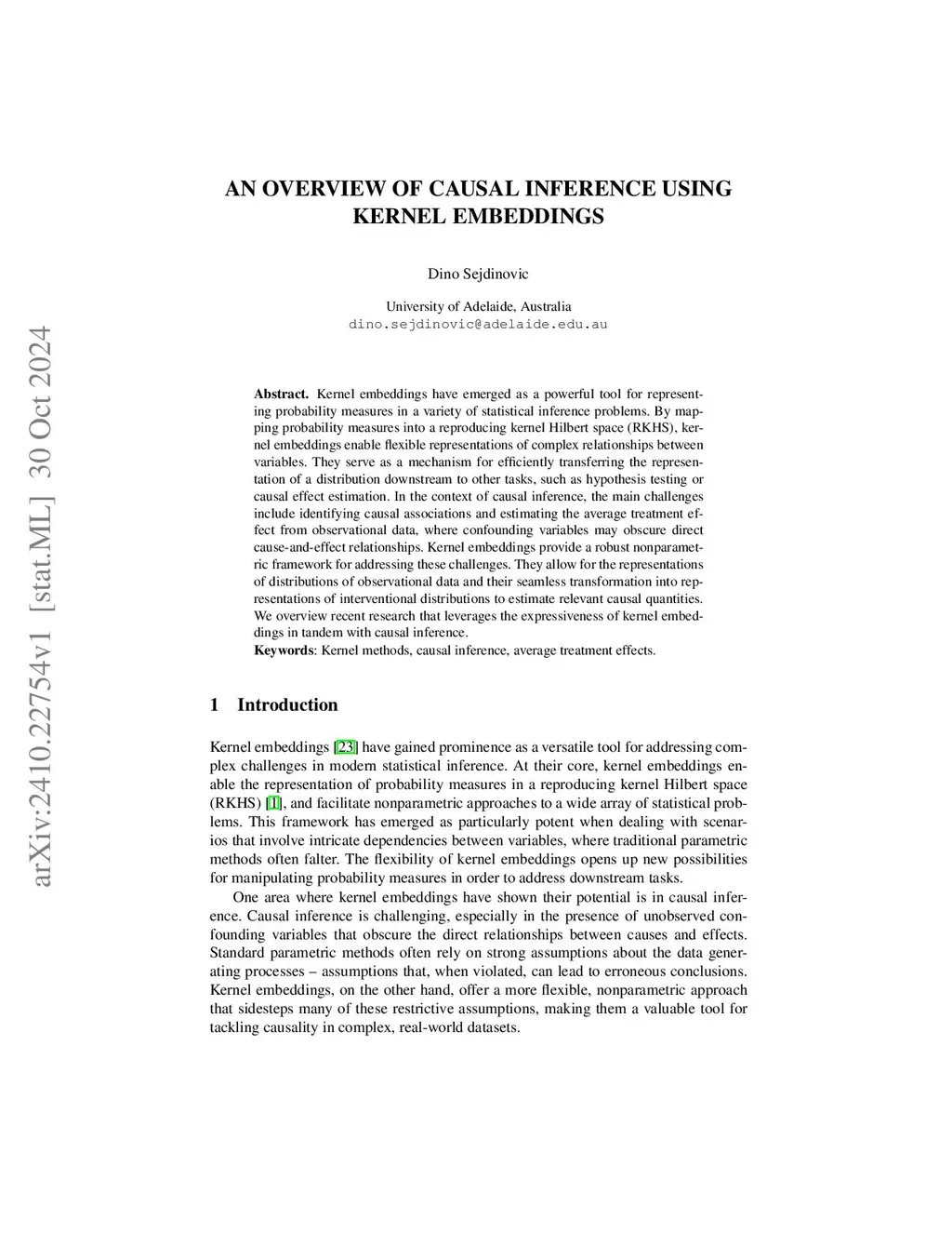 Kernel embeddings have emerged as a powerful tool for representing probability measures in a variety of statistical inference problems. By mapping probability measures into a reproducing kernel Hilbert space (RKHS), kernel embeddings enable flexible representations of complex relationships between variables. They serve as a mechanism for efficiently transferring the representation of a distribution downstream to other tasks, such as hypothesis testing or causal effect estimation. In the context of causal inference, the main challenges include identifying causal associations and estimating the average treatment effect from observational data, where confounding variables may obscure direct cause-and-effect relationships. Kernel embeddings provide a robust nonparametric framework for addressing these challenges. They allow for the representations of distributions of observational data and their seamless transformation into representations of interventional distributions to estimate relevant causal quantities. We overview recent research that leverages the expressiveness of kernel embeddings in tandem with causal inference.