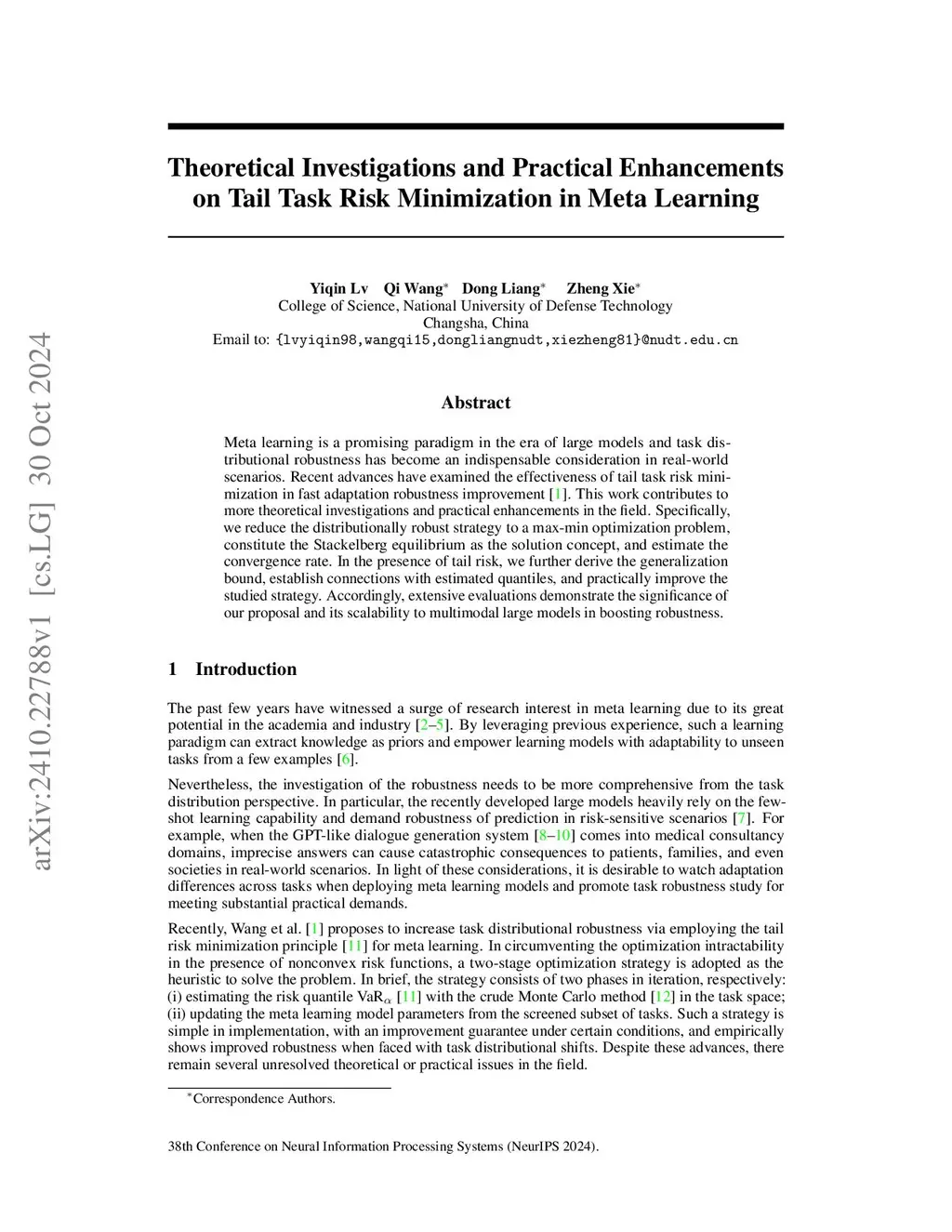 Meta learning is a promising paradigm in the era of large models and task distributional robustness has become an indispensable consideration in real-world scenarios. Recent advances have examined the effectiveness of tail task risk minimization in fast adaptation robustness improvement \citep{wang2023simple}. This work contributes to more theoretical investigations and practical enhancements in the field. Specifically, we reduce the distributionally robust strategy to a max-min optimization problem, constitute the Stackelberg equilibrium as the solution concept, and estimate the convergence rate. In the presence of tail risk, we further derive the generalization bound, establish connections with estimated quantiles, and practically improve the studied strategy. Accordingly, extensive evaluations demonstrate the significance of our proposal and its scalability to multimodal large models in boosting robustness.