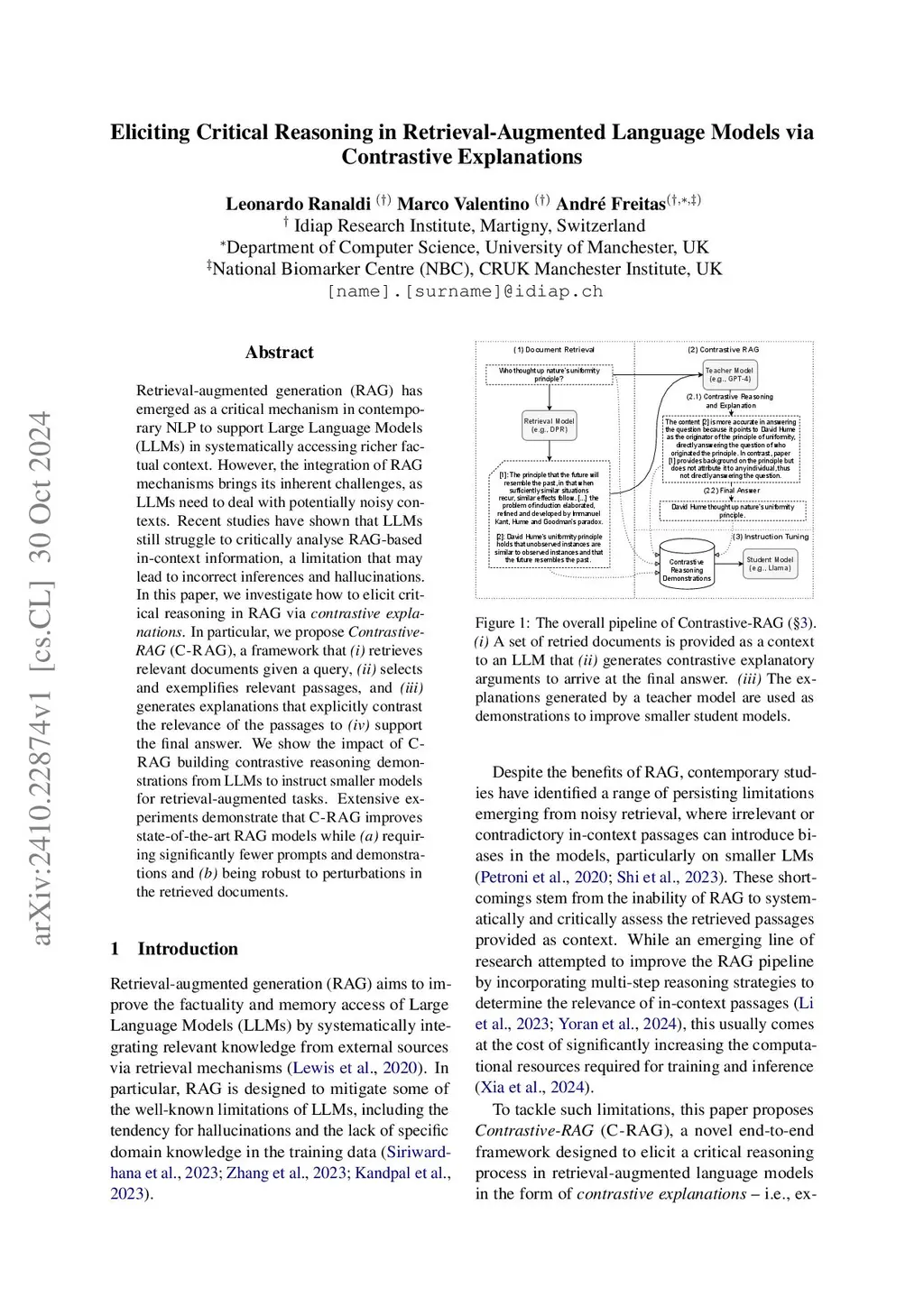 Retrieval-augmented generation (RAG) has emerged as a critical mechanism in contemporary NLP to support Large Language Models(LLMs) in systematically accessing richer factual context. However, the integration of RAG mechanisms brings its inherent challenges, as LLMs need to deal with potentially noisy contexts. Recent studies have shown that LLMs still struggle to critically analyse RAG-based in-context information, a limitation that may lead to incorrect inferences and hallucinations. In this paper, we investigate how to elicit critical reasoning in RAG via contrastive explanations. In particular, we propose Contrastive-RAG (C-RAG), a framework that (i) retrieves relevant documents given a query, (ii) selects and exemplifies relevant passages, and (iii) generates explanations that explicitly contrast the relevance of the passages to (iv) support the final answer. We show the impact of C-RAG building contrastive reasoning demonstrations from LLMs to instruct smaller models for retrieval-augmented tasks. Extensive experiments demonstrate that C-RAG improves state-of-the-art RAG models while (a) requiring significantly fewer prompts and demonstrations and (b) being robust to perturbations in the retrieved documents.