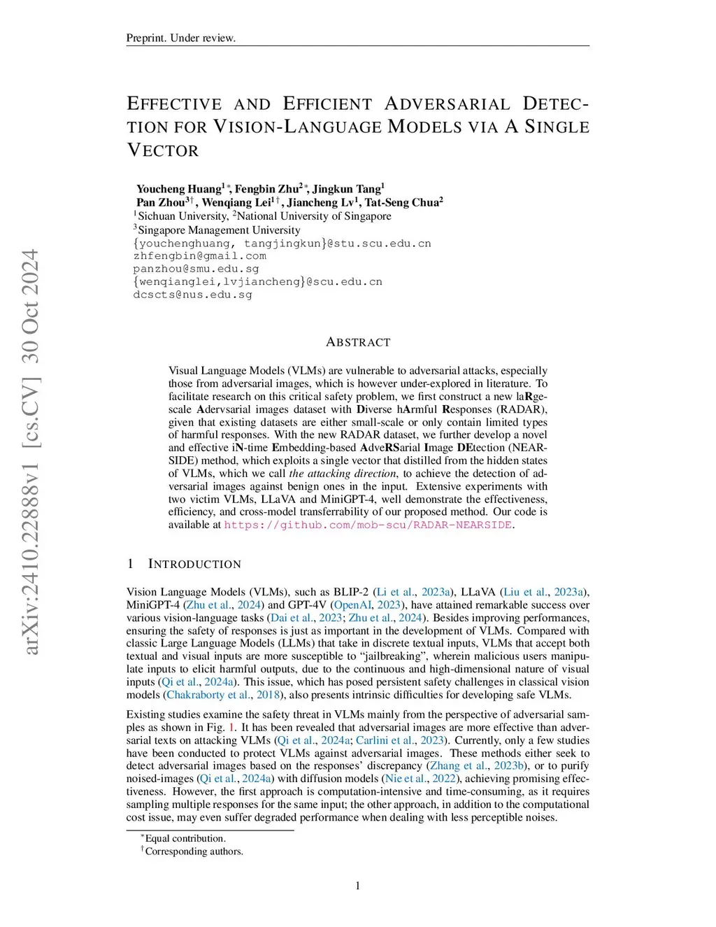 Visual Language Models (VLMs) are vulnerable to adversarial attacks, especially those from adversarial images, which is however under-explored in literature. To facilitate research on this critical safety problem, we first construct a new laRge-scale Adervsarial images dataset with Diverse hArmful Responses (RADAR), given that existing datasets are either small-scale or only contain limited types of harmful responses. With the new RADAR dataset, we further develop a novel and effective iN-time Embedding-based AdveRSarial Image DEtection (NEARSIDE) method, which exploits a single vector that distilled from the hidden states of VLMs, which we call the attacking direction, to achieve the detection of adversarial images against benign ones in the input. Extensive experiments with two victim VLMs, LLaVA and MiniGPT-4, well demonstrate the effectiveness, efficiency, and cross-model transferrability of our proposed method. Our code is available at https://github.com/mob-scu/RADAR-NEARSIDE