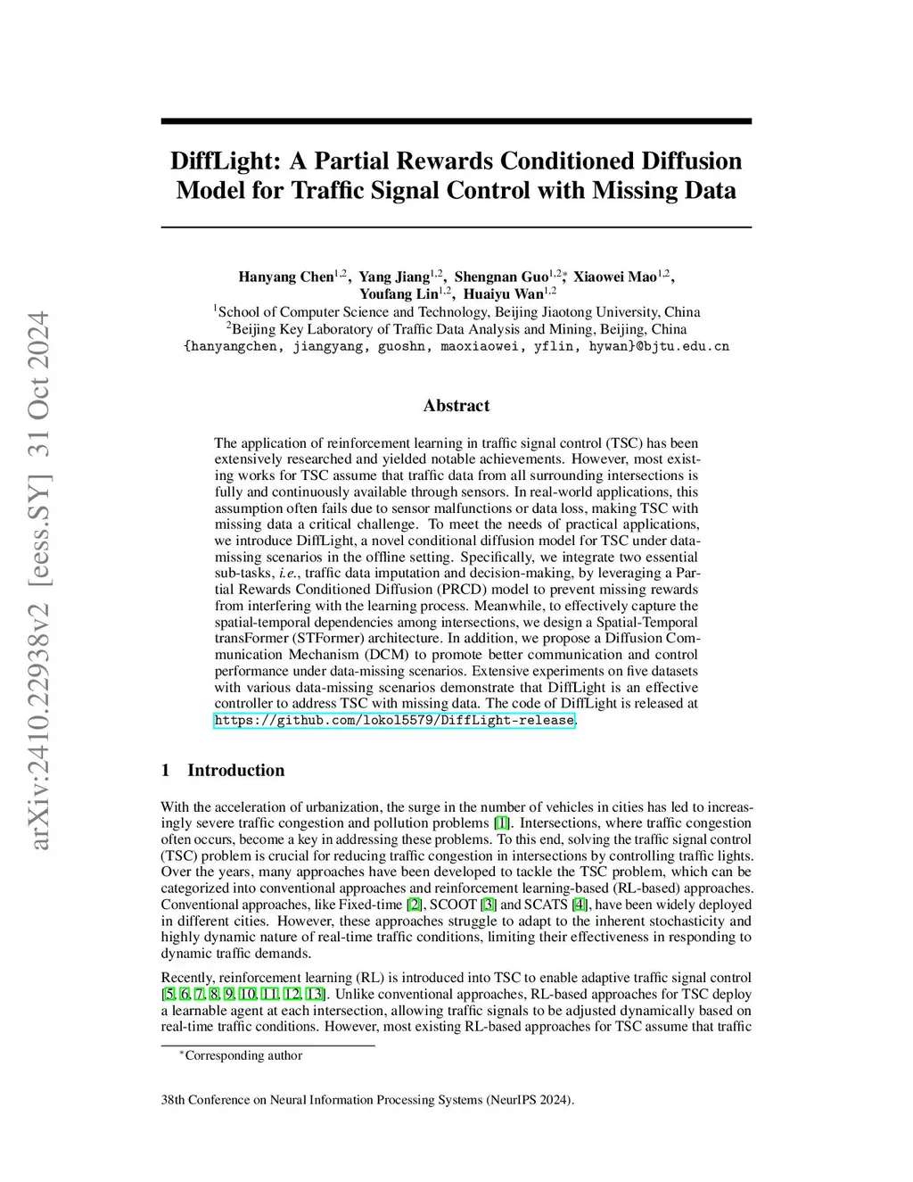 DiffLight: A Partial Rewards Conditioned Diffusion Model for Traffic