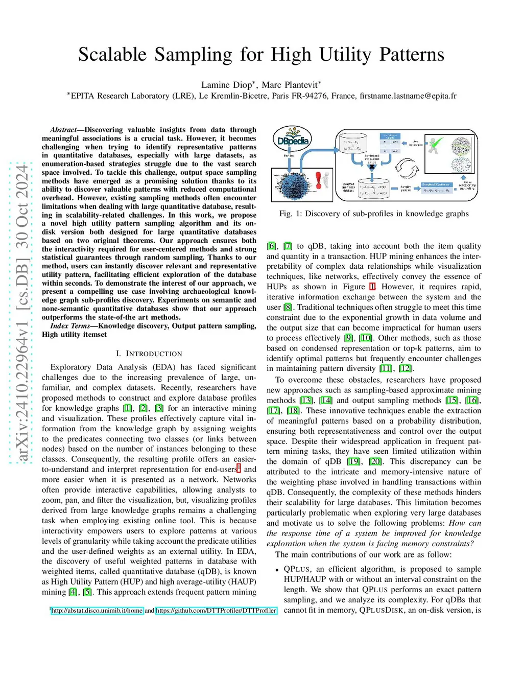 Discovering valuable insights from data through meaningful associations is a crucial task. However, it becomes challenging when trying to identify representative patterns in quantitative databases, especially with large datasets, as enumeration-based strategies struggle due to the vast search space involved. To tackle this challenge, output space sampling methods have emerged as a promising solution thanks to its ability to discover valuable patterns with reduced computational overhead. However, existing sampling methods often encounter limitations when dealing with large quantitative database, resulting in scalability-related challenges. In this work, we propose a novel high utility pattern sampling algorithm and its on-disk version both designed for large quantitative databases based on two original theorems. Our approach ensures both the interactivity required for user-centered methods and strong statistical guarantees through random sampling. Thanks to our method, users can instantly discover relevant and representative utility pattern, facilitating efficient exploration of the database within seconds. To demonstrate the interest of our approach, we present a compelling use case involving archaeological knowledge graph sub-profiles discovery. Experiments on semantic and none-semantic quantitative databases show that our approach outperforms the state-of-the art methods.
