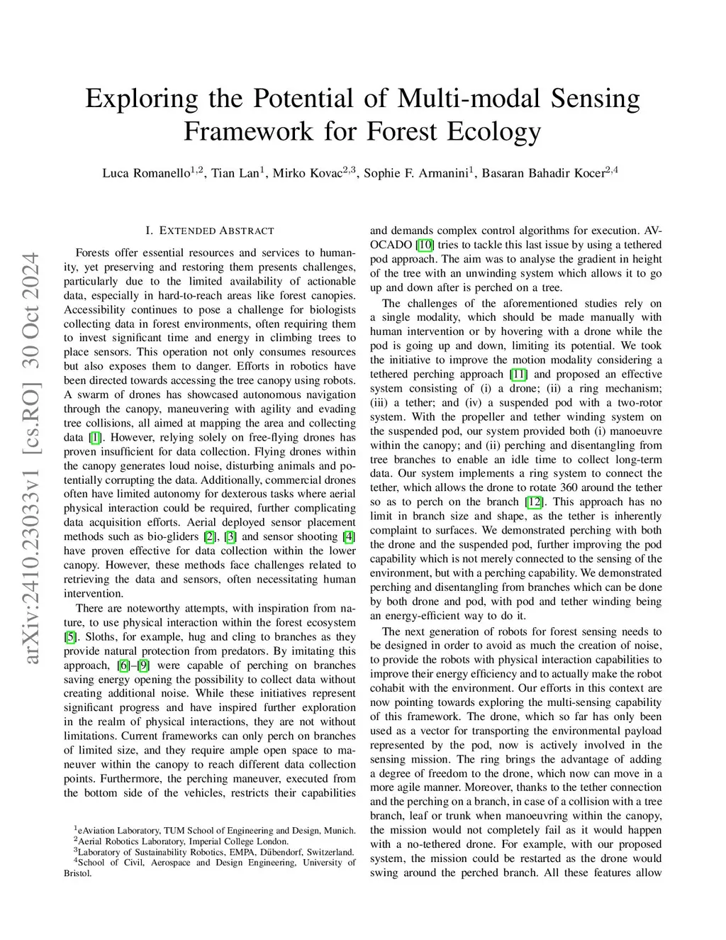 Forests offer essential resources and services to humanity, yet preserving and restoring them presents challenges, particularly due to the limited availability of actionable data, especially in hard-to-reach areas like forest canopies. Accessibility continues to pose a challenge for biologists collecting data in forest environments, often requiring them to invest significant time and energy in climbing trees to place sensors. This operation not only consumes resources but also exposes them to danger. Efforts in robotics have been directed towards accessing the tree canopy using robots. A swarm of drones has showcased autonomous navigation through the canopy, maneuvering with agility and evading tree collisions, all aimed at mapping the area and collecting data. However, relying solely on free-flying drones has proven insufficient for data collection. Flying drones within the canopy generates loud noise, disturbing animals and potentially corrupting the data. Additionally, commercial drones often have limited autonomy for dexterous tasks where aerial physical interaction could be required, further complicating data acquisition efforts. Aerial deployed sensor placement methods such as bio-gliders and sensor shooting have proven effective for data collection within the lower canopy. However, these methods face challenges related to retrieving the data and sensors, often necessitating human intervention.