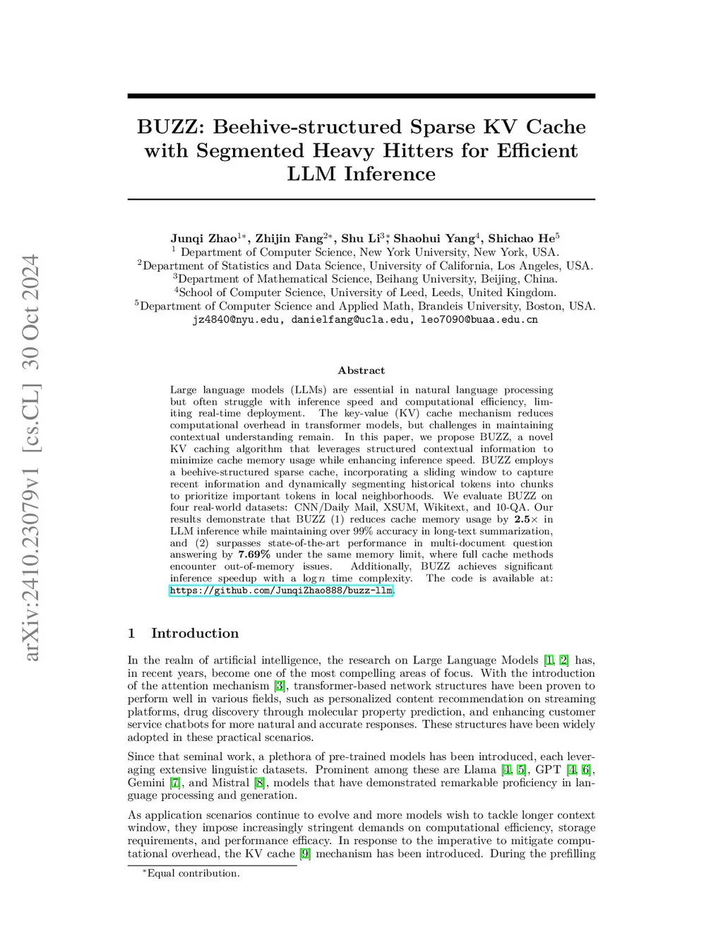 Large language models (LLMs) are essential in natural language processing but often struggle with inference speed and computational efficiency, limiting real-time deployment. The key-value (KV) cache mechanism reduces computational overhead in transformer models, but challenges in maintaining contextual understanding remain. In this paper, we propose BUZZ, a novel KV caching algorithm that leverages structured contextual information to minimize cache memory usage while enhancing inference speed. BUZZ employs a beehive-structured sparse cache, incorporating a sliding window to capture recent information and dynamically segmenting historical tokens into chunks to prioritize important tokens in local neighborhoods. We evaluate BUZZ on four real-world datasets: CNN/Daily Mail, XSUM, Wikitext, and 10-QA. Our results demonstrate that BUZZ (1) reduces cache memory usage by in LLM inference while maintaining over 99% accuracy in long-text summarization, and (2) surpasses state-of-the-art performance in multi-document question answering by \textbf{7.69%} under the same memory limit, where full cache methods encounter out-of-memory issues. Additionally, BUZZ achieves significant inference speedup with a time complexity. The code is available at https://github.com/JunqiZhao888/buzz-llm.