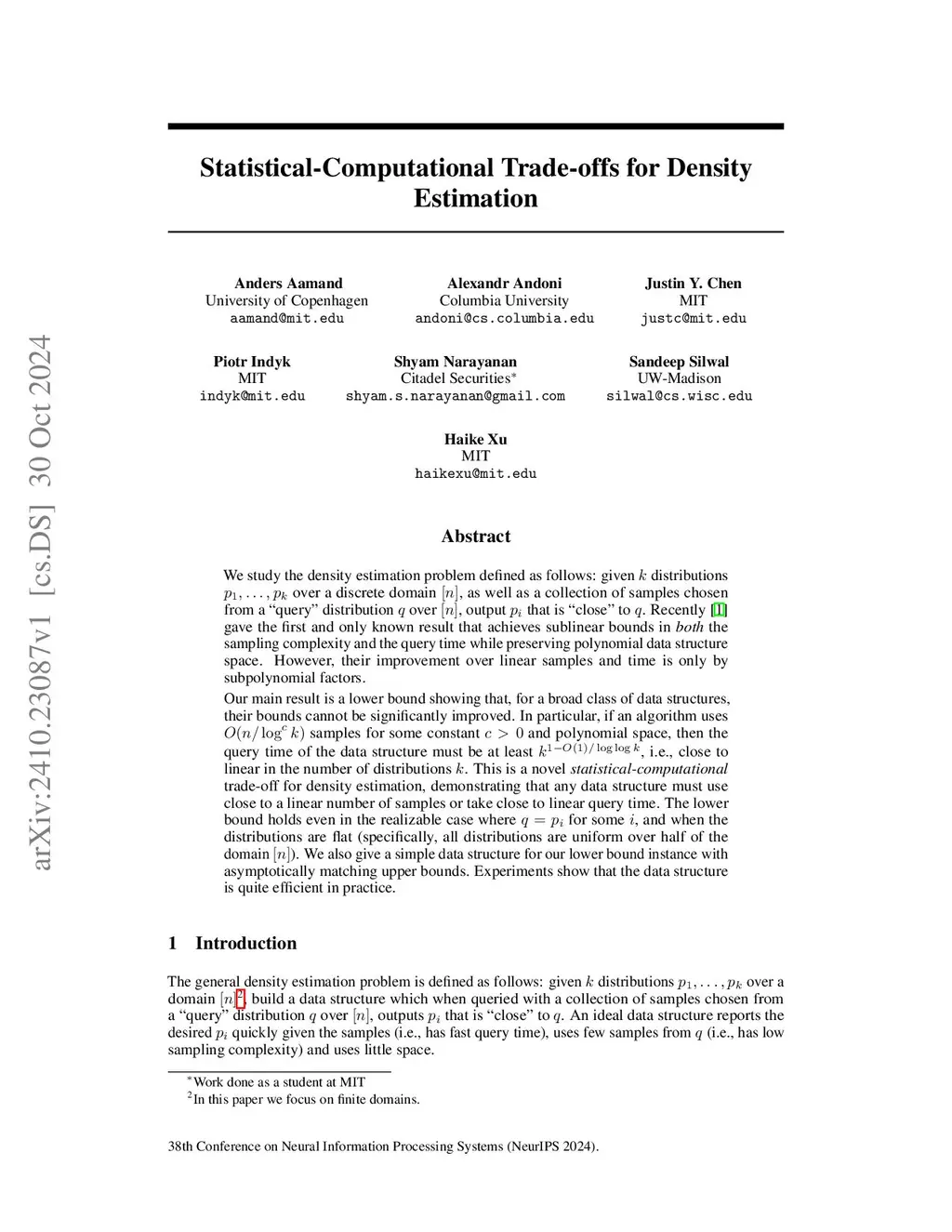 We study the density estimation problem defined as follows: given distributions over a discrete domain , as well as a collection of samples chosen from a ``query'' distribution over , output that is ``close'' to . Recently~\cite{aamand2023data} gave the first and only known result that achieves sublinear bounds in {\em both} the sampling complexity and the query time while preserving polynomial data structure space. However, their improvement over linear samples and time is only by subpolynomial factors. Our main result is a lower bound showing that, for a broad class of data structures, their bounds cannot be significantly improved. In particular, if an algorithm uses samples for some constant and polynomial space, then the query time of the data structure must be at least , i.e., close to linear in the number of distributions . This is a novel \emph{statistical-computational} trade-off for density estimation, demonstrating that any data structure must use close to a linear number of samples or take close to linear query time. The lower bound holds even in the realizable case where for some , and when the distributions are flat (specifically, all distributions are uniform over half of the domain ). We also give a simple data structure for our lower bound instance with asymptotically matching upper bounds. Experiments show that the data structure is quite efficient in practice.