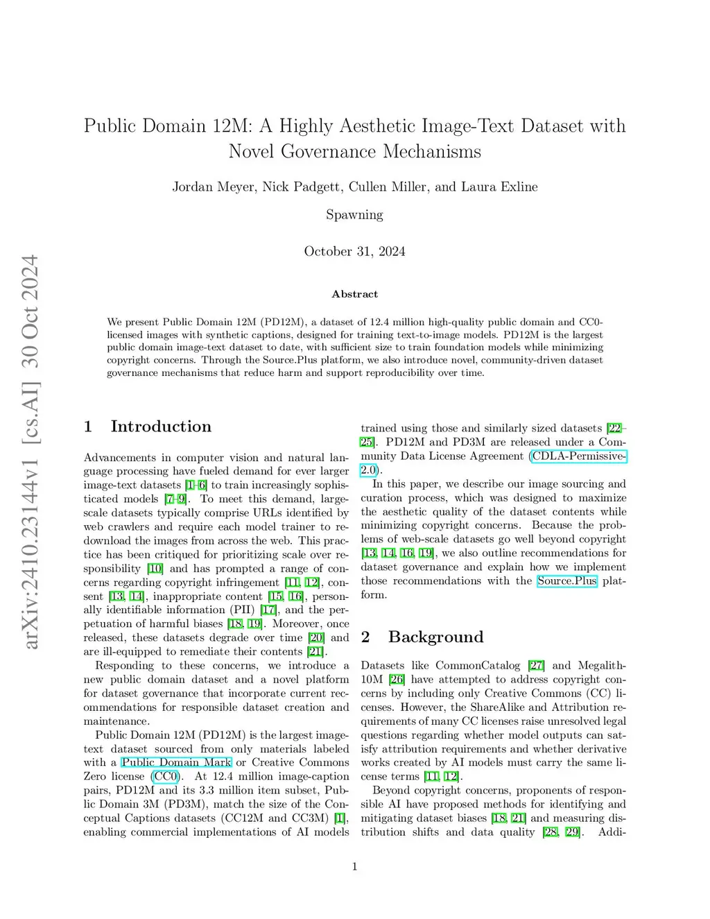 We present Public Domain 12M (PD12M), a dataset of 12.4 million high-quality public domain and CC0-licensed images with synthetic captions, designed for training text-to-image models. PD12M is the largest public domain image-text dataset to date, with sufficient size to train foundation models while minimizing copyright concerns. Through the Source.Plus platform, we also introduce novel, community-driven dataset governance mechanisms that reduce harm and support reproducibility over time.