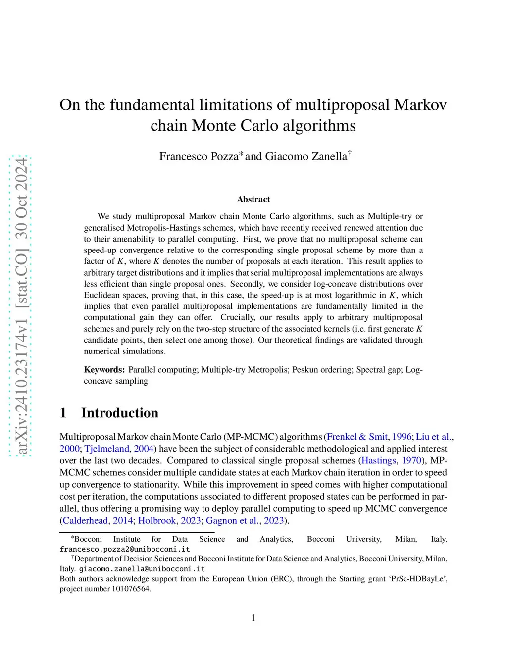 We study multiproposal Markov chain Monte Carlo algorithms, such as Multiple-try or generalised Metropolis-Hastings schemes, which have recently received renewed attention due to their amenability to parallel computing. First, we prove that no multiproposal scheme can speed-up convergence relative to the corresponding single proposal scheme by more than a factor of , where denotes the number of proposals at each iteration. This result applies to arbitrary target distributions and it implies that serial multiproposal implementations are always less efficient than single proposal ones. Secondly, we consider log-concave distributions over Euclidean spaces, proving that, in this case, the speed-up is at most logarithmic in , which implies that even parallel multiproposal implementations are fundamentally limited in the computational gain they can offer. Crucially, our results apply to arbitrary multiproposal schemes and purely rely on the two-step structure of the associated kernels (i.e. first generate candidate points, then select one among those). Our theoretical findings are validated through numerical simulations.