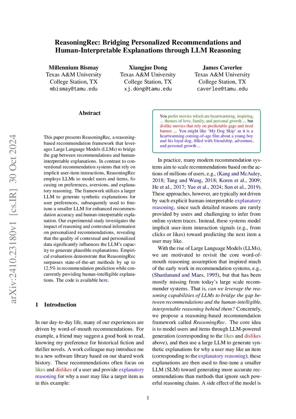 ReasoningRec: Bridging Personalized Recommendations and