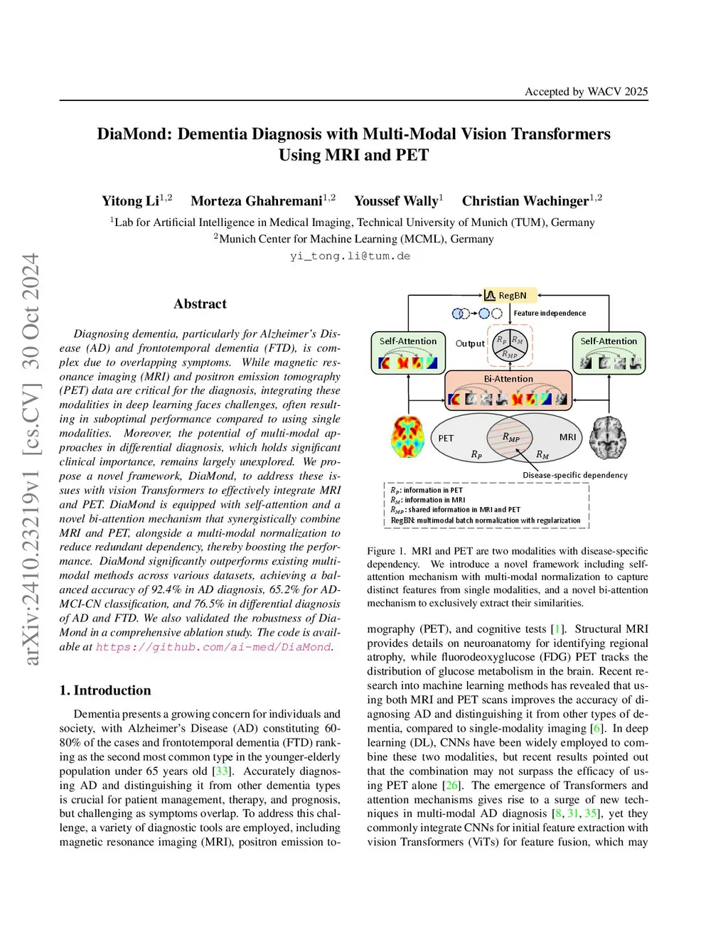 Diagnosing dementia, particularly for Alzheimer's Disease (AD) and frontotemporal dementia (FTD), is complex due to overlapping symptoms. While magnetic resonance imaging (MRI) and positron emission tomography (PET) data are critical for the diagnosis, integrating these modalities in deep learning faces challenges, often resulting in suboptimal performance compared to using single modalities. Moreover, the potential of multi-modal approaches in differential diagnosis, which holds significant clinical importance, remains largely unexplored. We propose a novel framework, DiaMond, to address these issues with vision Transformers to effectively integrate MRI and PET. DiaMond is equipped with self-attention and a novel bi-attention mechanism that synergistically combine MRI and PET, alongside a multi-modal normalization to reduce redundant dependency, thereby boosting the performance. DiaMond significantly outperforms existing multi-modal methods across various datasets, achieving a balanced accuracy of 92.4% in AD diagnosis, 65.2% for AD-MCI-CN classification, and 76.5% in differential diagnosis of AD and FTD. We also validated the robustness of DiaMond in a comprehensive ablation study. The code is available at https://github.com/ai-med/DiaMond.