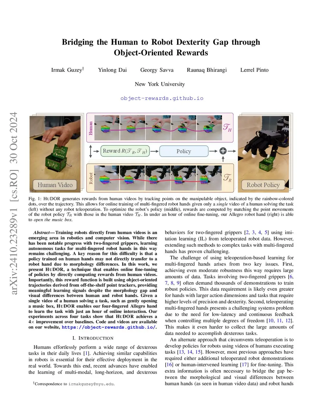 Training robots directly from human videos is an emerging area in robotics and computer vision. While there has been notable progress with two-fingered grippers, learning autonomous tasks for multi-fingered robot hands in this way remains challenging. A key reason for this difficulty is that a policy trained on human hands may not directly transfer to a robot hand due to morphology differences. In this work, we present HuDOR, a technique that enables online fine-tuning of policies by directly computing rewards from human videos. Importantly, this reward function is built using object-oriented trajectories derived from off-the-shelf point trackers, providing meaningful learning signals despite the morphology gap and visual differences between human and robot hands. Given a single video of a human solving a task, such as gently opening a music box, HuDOR enables our four-fingered Allegro hand to learn the task with just an hour of online interaction. Our experiments across four tasks show that HuDOR achieves a 4x improvement over baselines. Code and videos are available on our website, https://object-rewards.github.io.