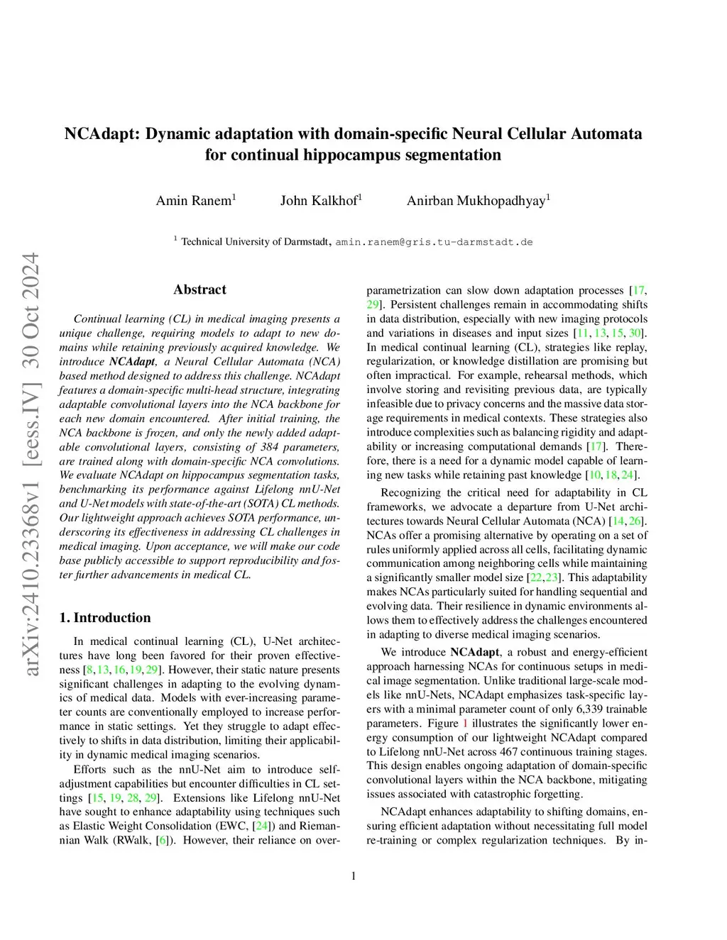 Continual learning (CL) in medical imaging presents a unique challenge, requiring models to adapt to new domains while retaining previously acquired knowledge. We introduce NCAdapt, a Neural Cellular Automata (NCA) based method designed to address this challenge. NCAdapt features a domain-specific multi-head structure, integrating adaptable convolutional layers into the NCA backbone for each new domain encountered. After initial training, the NCA backbone is frozen, and only the newly added adaptable convolutional layers, consisting of 384 parameters, are trained along with domain-specific NCA convolutions. We evaluate NCAdapt on hippocampus segmentation tasks, benchmarking its performance against Lifelong nnU-Net and U-Net models with state-of-the-art (SOTA) CL methods. Our lightweight approach achieves SOTA performance, underscoring its effectiveness in addressing CL challenges in medical imaging. Upon acceptance, we will make our code base publicly accessible to support reproducibility and foster further advancements in medical CL.
