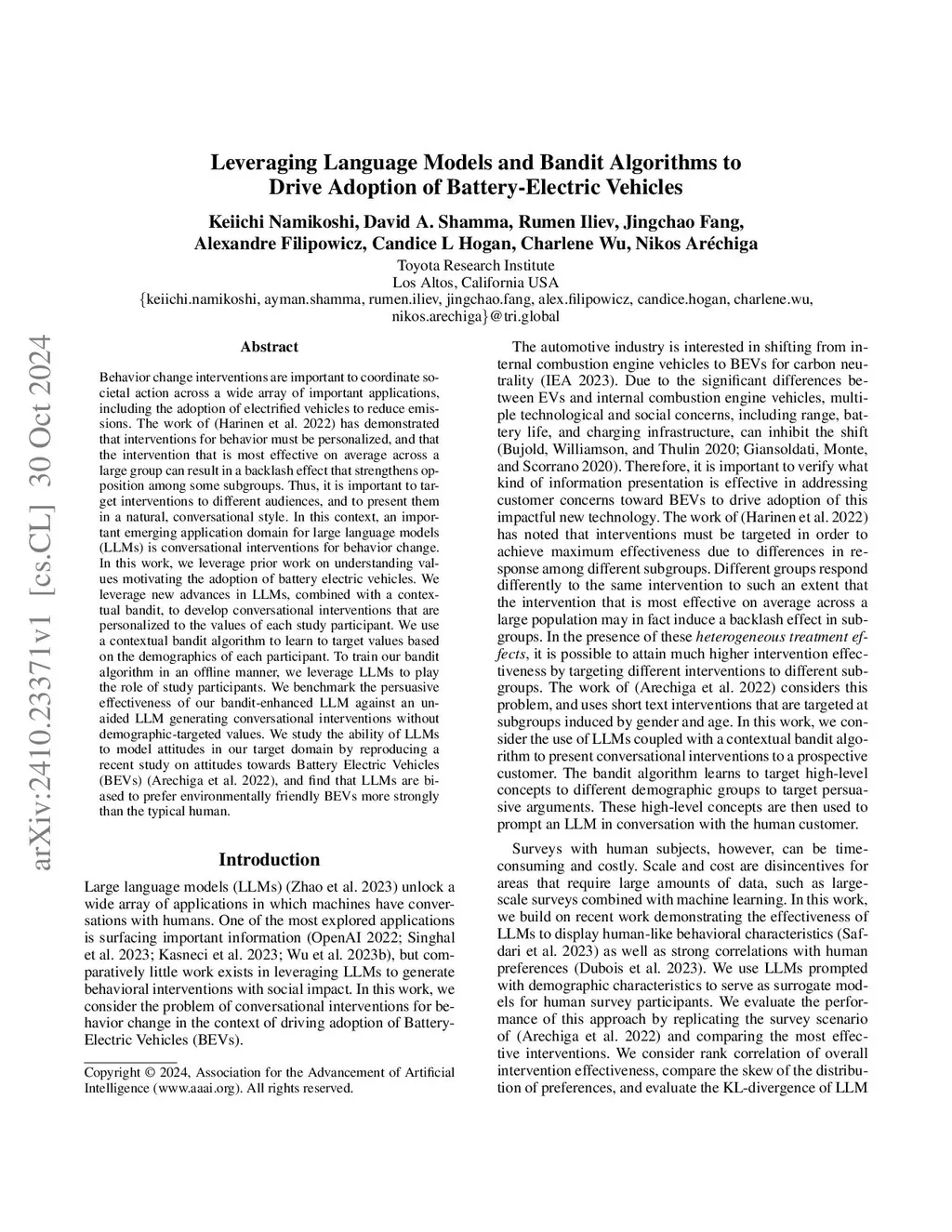 Behavior change interventions are important to coordinate societal action across a wide array of important applications, including the adoption of electrified vehicles to reduce emissions. Prior work has demonstrated that interventions for behavior must be personalized, and that the intervention that is most effective on average across a large group can result in a backlash effect that strengthens opposition among some subgroups. Thus, it is important to target interventions to different audiences, and to present them in a natural, conversational style. In this context, an important emerging application domain for large language models (LLMs) is conversational interventions for behavior change. In this work, we leverage prior work on understanding values motivating the adoption of battery electric vehicles. We leverage new advances in LLMs, combined with a contextual bandit, to develop conversational interventions that are personalized to the values of each study participant. We use a contextual bandit algorithm to learn to target values based on the demographics of each participant. To train our bandit algorithm in an offline manner, we leverage LLMs to play the role of study participants. We benchmark the persuasive effectiveness of our bandit-enhanced LLM against an unaided LLM generating conversational interventions without demographic-targeted values.