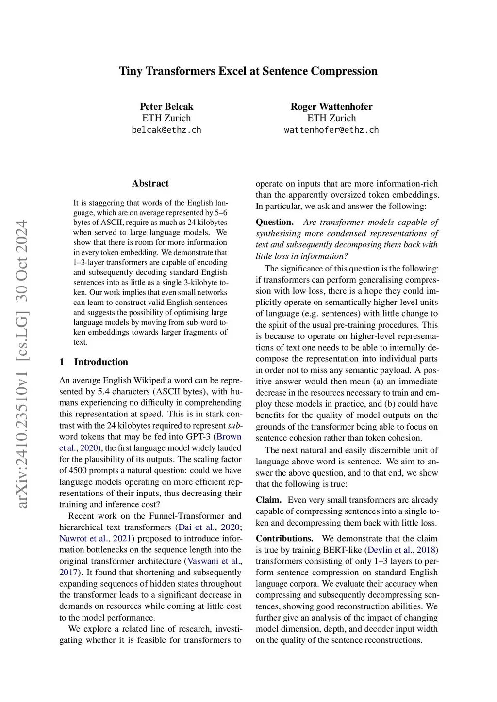It is staggering that words of the English language, which are on average represented by 5--6 bytes of ASCII, require as much as 24 kilobytes when served to large language models. We show that there is room for more information in every token embedding. We demonstrate that 1--3-layer transformers are capable of encoding and subsequently decoding standard English sentences into as little as a single 3-kilobyte token. Our work implies that even small networks can learn to construct valid English sentences and suggests the possibility of optimising large language models by moving from sub-word token embeddings towards larger fragments of text.