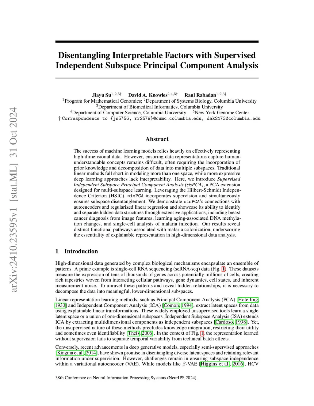 The success of machine learning models relies heavily on effectively representing high-dimensional data. However, ensuring data representations capture human-understandable concepts remains difficult, often requiring the incorporation of prior knowledge and decomposition of data into multiple subspaces. Traditional linear methods fall short in modeling more than one space, while more expressive deep learning approaches lack interpretability. Here, we introduce Supervised Independent Subspace Principal Component Analysis (), a PCA extension designed for multi-subspace learning. Leveraging the Hilbert-Schmidt Independence Criterion (HSIC), incorporates supervision and simultaneously ensures subspace disentanglement. We demonstrate 's connections with autoencoders and regularized linear regression and showcase its ability to identify and separate hidden data structures through extensive applications, including breast cancer diagnosis from image features, learning aging-associated DNA methylation changes, and single-cell analysis of malaria infection. Our results reveal distinct functional pathways associated with malaria colonization, underscoring the essentiality of explainable representation in high-dimensional data analysis.