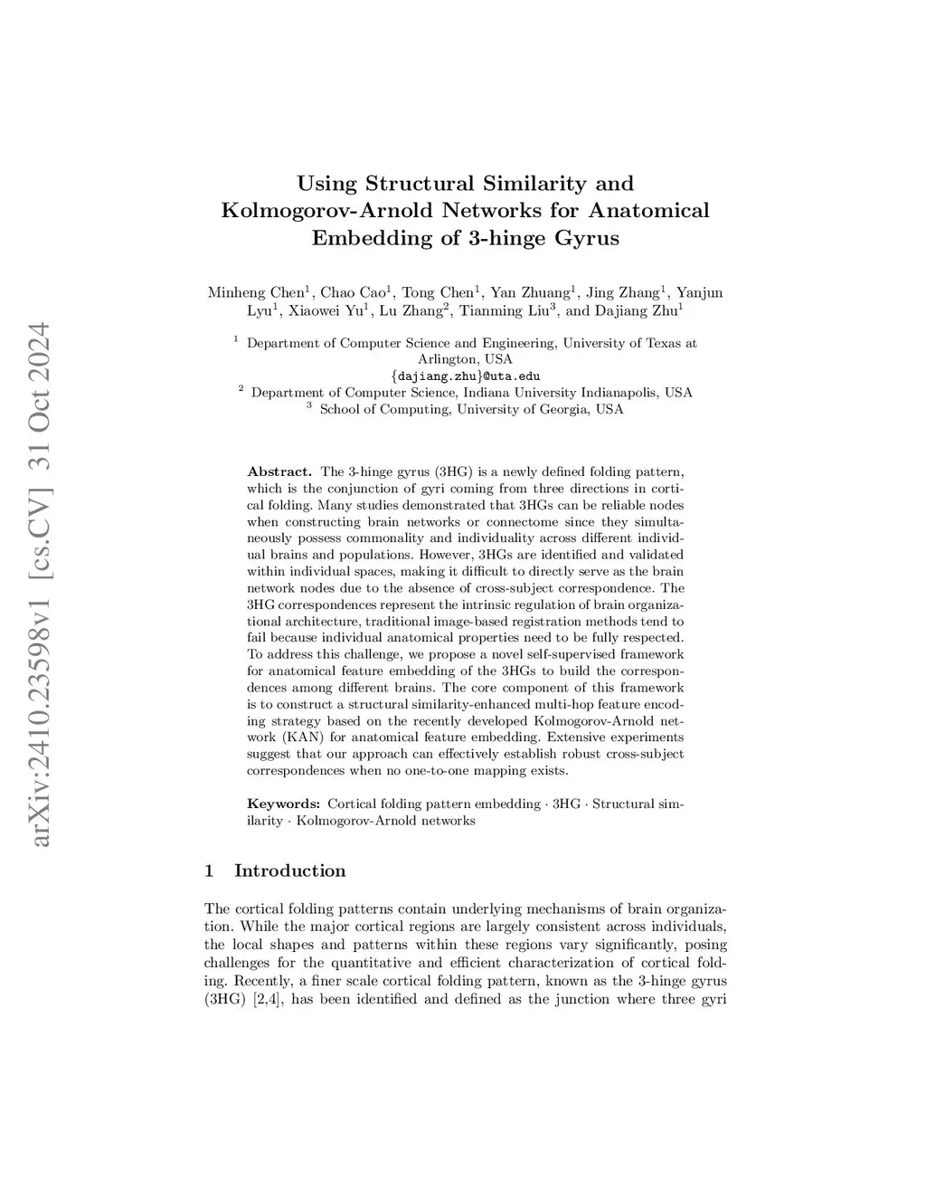 The 3-hinge gyrus (3HG) is a newly defined folding pattern, which is the conjunction of gyri coming from three directions in cortical folding. Many studies demonstrated that 3HGs can be reliable nodes when constructing brain networks or connectome since they simultaneously possess commonality and individuality across different individual brains and populations. However, 3HGs are identified and validated within individual spaces, making it difficult to directly serve as the brain network nodes due to the absence of cross-subject correspondence. The 3HG correspondences represent the intrinsic regulation of brain organizational architecture, traditional image-based registration methods tend to fail because individual anatomical properties need to be fully respected. To address this challenge, we propose a novel self-supervised framework for anatomical feature embedding of the 3HGs to build the correspondences among different brains. The core component of this framework is to construct a structural similarity-enhanced multi-hop feature encoding strategy based on the recently developed Kolmogorov-Arnold network (KAN) for anatomical feature embedding. Extensive experiments suggest that our approach can effectively establish robust cross-subject correspondences when no one-to-one mapping exists.