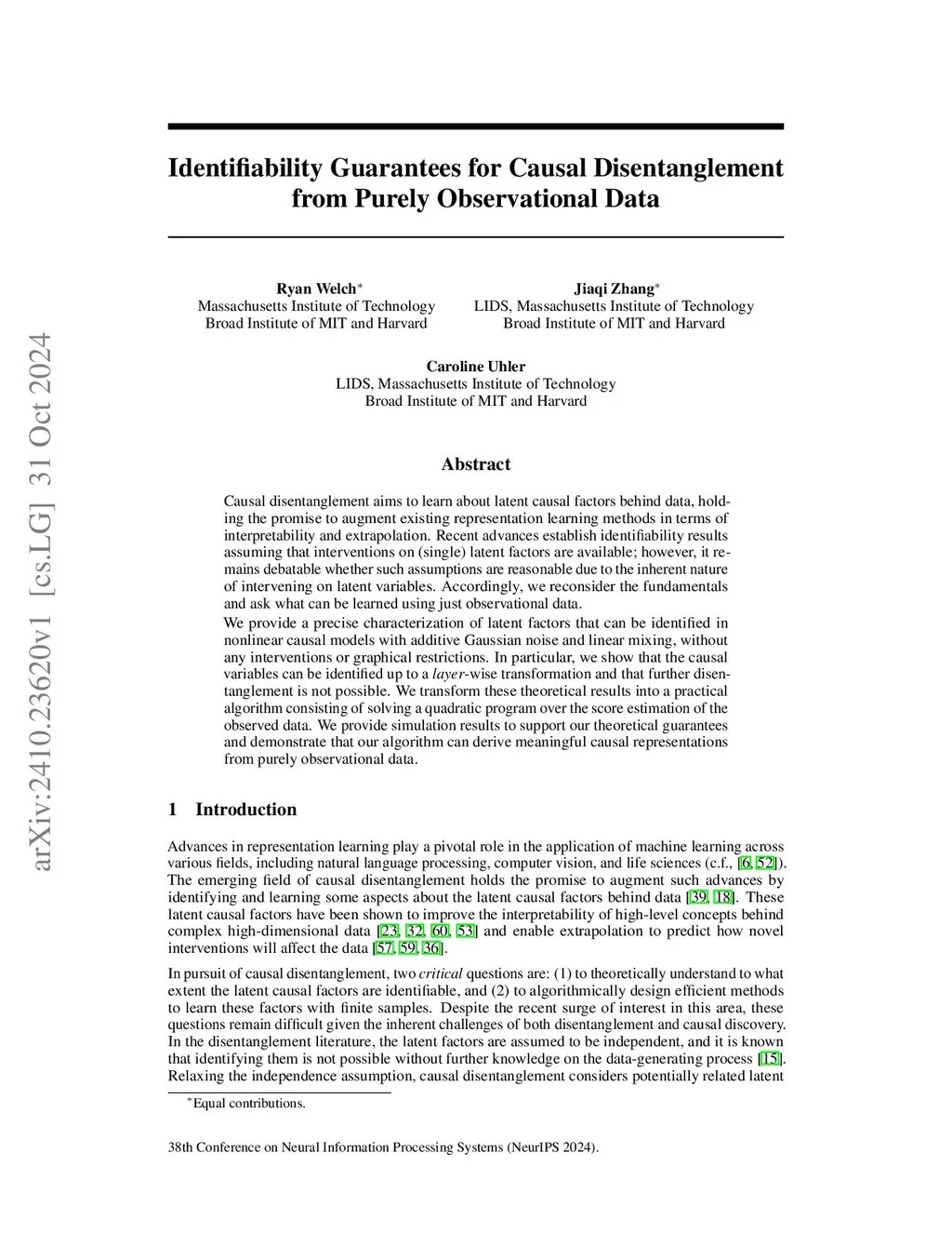 Causal disentanglement aims to learn about latent causal factors behind data, holding the promise to augment existing representation learning methods in terms of interpretability and extrapolation. Recent advances establish identifiability results assuming that interventions on (single) latent factors are available; however, it remains debatable whether such assumptions are reasonable due to the inherent nature of intervening on latent variables. Accordingly, we reconsider the fundamentals and ask what can be learned using just observational data. We provide a precise characterization of latent factors that can be identified in nonlinear causal models with additive Gaussian noise and linear mixing, without any interventions or graphical restrictions. In particular, we show that the causal variables can be identified up to a layer-wise transformation and that further disentanglement is not possible. We transform these theoretical results into a practical algorithm consisting of solving a quadratic program over the score estimation of the observed data. We provide simulation results to support our theoretical guarantees and demonstrate that our algorithm can derive meaningful causal representations from purely observational data.