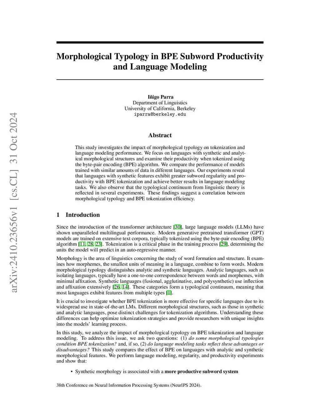 This study investigates the impact of morphological typology on tokenization and language modeling performance. We focus on languages with synthetic and analytical morphological structures and examine their productivity when tokenized using the byte-pair encoding (BPE) algorithm. We compare the performance of models trained with similar amounts of data in different languages. Our experiments reveal that languages with synthetic features exhibit greater subword regularity and productivity with BPE tokenization and achieve better results in language modeling tasks. We also observe that the typological continuum from linguistic theory is reflected in several experiments. These findings suggest a correlation between morphological typology and BPE tokenization efficiency.