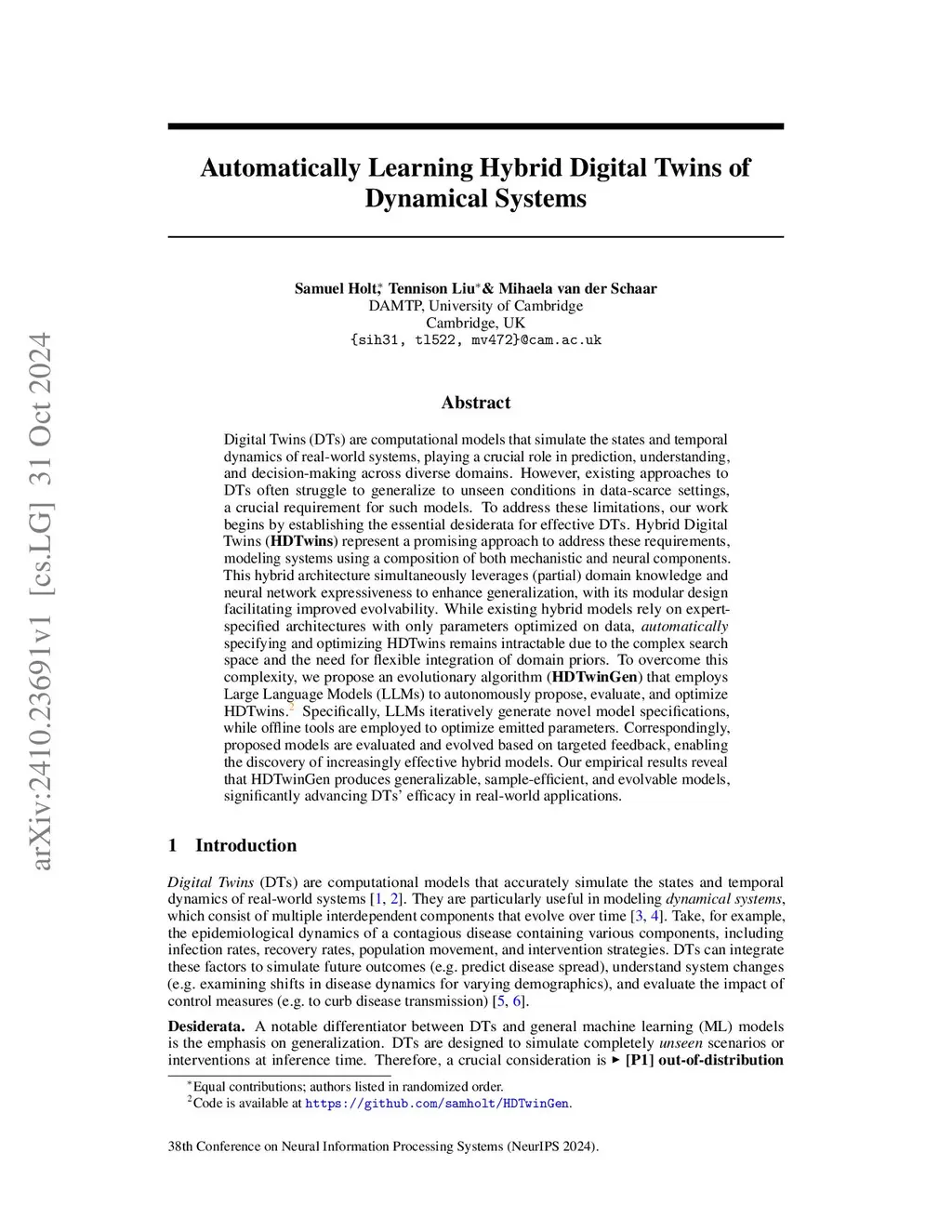 Digital Twins (DTs) are computational models that simulate the states and temporal dynamics of real-world systems, playing a crucial role in prediction, understanding, and decision-making across diverse domains. However, existing approaches to DTs often struggle to generalize to unseen conditions in data-scarce settings, a crucial requirement for such models. To address these limitations, our work begins by establishing the essential desiderata for effective DTs. Hybrid Digital Twins () represent a promising approach to address these requirements, modeling systems using a composition of both mechanistic and neural components. This hybrid architecture simultaneously leverages (partial) domain knowledge and neural network expressiveness to enhance generalization, with its modular design facilitating improved evolvability. While existing hybrid models rely on expert-specified architectures with only parameters optimized on data, specifying and optimizing HDTwins remains intractable due to the complex search space and the need for flexible integration of domain priors. To overcome this complexity, we propose an evolutionary algorithm () that employs Large Language Models (LLMs) to autonomously propose, evaluate, and optimize HDTwins. Specifically, LLMs iteratively generate novel model specifications, while offline tools are employed to optimize emitted parameters. Correspondingly, proposed models are evaluated and evolved based on targeted feedback, enabling the discovery of increasingly effective hybrid models. Our empirical results reveal that HDTwinGen produces generalizable, sample-efficient, and evolvable models, significantly advancing DTs' efficacy in real-world applications.