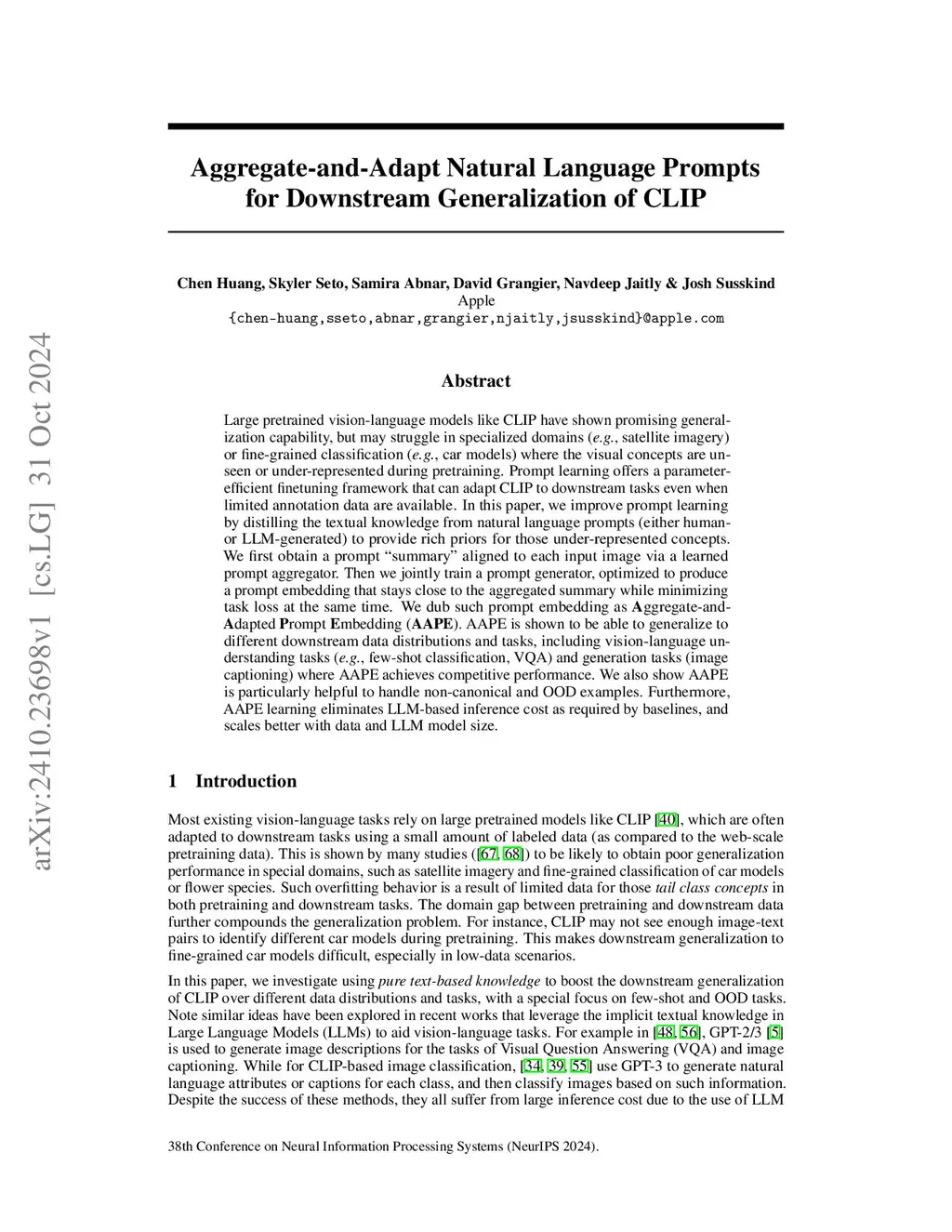 Large pretrained vision-language models like CLIP have shown promising generalization capability, but may struggle in specialized domains (e.g., satellite imagery) or fine-grained classification (e.g., car models) where the visual concepts are unseen or under-represented during pretraining. Prompt learning offers a parameter-efficient finetuning framework that can adapt CLIP to downstream tasks even when limited annotation data are available. In this paper, we improve prompt learning by distilling the textual knowledge from natural language prompts (either human- or LLM-generated) to provide rich priors for those under-represented concepts. We first obtain a prompt ``summary'' aligned to each input image via a learned prompt aggregator. Then we jointly train a prompt generator, optimized to produce a prompt embedding that stays close to the aggregated summary while minimizing task loss at the same time. We dub such prompt embedding as Aggregate-and-Adapted Prompt Embedding (AAPE). AAPE is shown to be able to generalize to different downstream data distributions and tasks, including vision-language understanding tasks (e.g., few-shot classification, VQA) and generation tasks (image captioning) where AAPE achieves competitive performance. We also show AAPE is particularly helpful to handle non-canonical and OOD examples. Furthermore, AAPE learning eliminates LLM-based inference cost as required by baselines, and scales better with data and LLM model size.