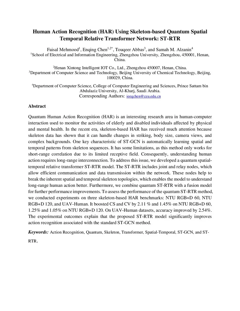 Human Action Recognition (HAR) is an interesting research area in human-computer interaction used to monitor the activities of elderly and disabled individuals affected by physical and mental health. In the recent era, skeleton-based HAR has received much attention because skeleton data has shown that it can handle changes in striking, body size, camera views, and complex backgrounds. One key characteristic of ST-GCN is automatically learning spatial and temporal patterns from skeleton sequences. It has some limitations, as this method only works for short-range correlation due to its limited receptive field. Consequently, understanding human action requires long-range interconnection. To address this issue, we developed a spatial-temporal relative transformer ST-RTR model. The ST-RTR includes joint and relay nodes, which allow efficient communication and data transmission within the network. These nodes help to break the inherent spatial and temporal skeleton topologies, which enables the model to understand long-range human action better. Furthermore, we combine ST-RTR with a fusion model for further performance improvements. To assess the performance of the ST-RTR method, we conducted experiments on three skeleton-based HAR benchmarks: NTU RGB+D 60, NTU RGB+D 120, and UAV-Human. It boosted CS and CV by 2.11 % and 1.45% on NTU RGB+D 60, 1.25% and 1.05% on NTU RGB+D 120. On UAV-Human datasets, accuracy improved by 2.54%. The experimental outcomes explain that the proposed ST-RTR model significantly improves action recognition associated with the standard ST-GCN method.