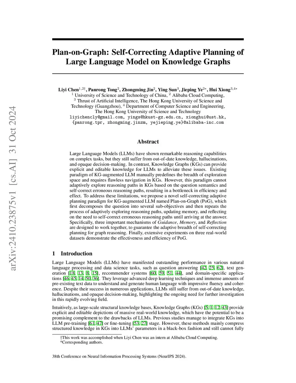 Large Language Models (LLMs) have shown remarkable reasoning capabilities on complex tasks, but they still suffer from out-of-date knowledge, hallucinations, and opaque decision-making. In contrast, Knowledge Graphs (KGs) can provide explicit and editable knowledge for LLMs to alleviate these issues. Existing paradigm of KG-augmented LLM manually predefines the breadth of exploration space and requires flawless navigation in KGs. However, this paradigm cannot adaptively explore reasoning paths in KGs based on the question semantics and self-correct erroneous reasoning paths, resulting in a bottleneck in efficiency and effect. To address these limitations, we propose a novel self-correcting adaptive planning paradigm for KG-augmented LLM named Plan-on-Graph (PoG), which first decomposes the question into several sub-objectives and then repeats the process of adaptively exploring reasoning paths, updating memory, and reflecting on the need to self-correct erroneous reasoning paths until arriving at the answer. Specifically, three important mechanisms of Guidance, Memory, and Reflection are designed to work together, to guarantee the adaptive breadth of self-correcting planning for graph reasoning. Finally, extensive experiments on three real-world datasets demonstrate the effectiveness and efficiency of PoG.
