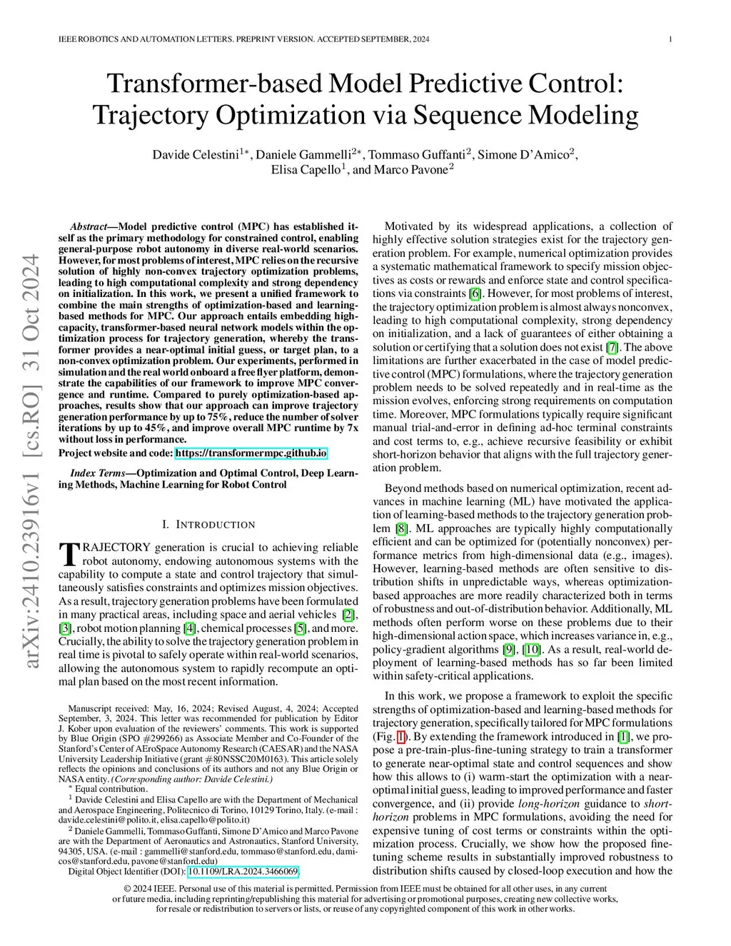 Model predictive control (MPC) has established itself as the primary methodology for constrained control, enabling general-purpose robot autonomy in diverse real-world scenarios. However, for most problems of interest, MPC relies on the recursive solution of highly non-convex trajectory optimization problems, leading to high computational complexity and strong dependency on initialization. In this work, we present a unified framework to combine the main strengths of optimization-based and learning-based methods for MPC. Our approach entails embedding high-capacity, transformer-based neural network models within the optimization process for trajectory generation, whereby the transformer provides a near-optimal initial guess, or target plan, to a non-convex optimization problem. Our experiments, performed in simulation and the real world onboard a free flyer platform, demonstrate the capabilities of our framework to improve MPC convergence and runtime. Compared to purely optimization-based approaches, results show that our approach can improve trajectory generation performance by up to 75%, reduce the number of solver iterations by up to 45%, and improve overall MPC runtime by 7x without loss in performance.