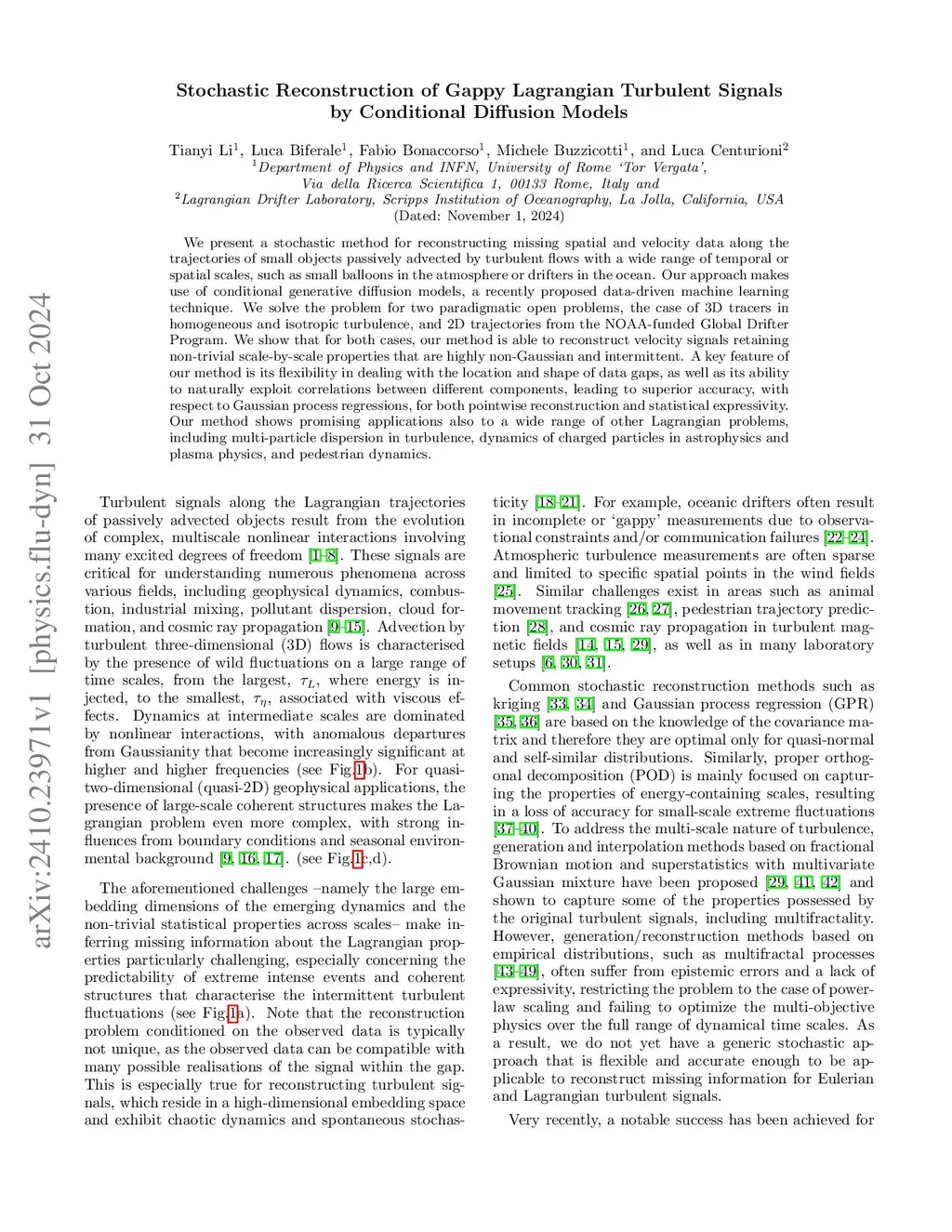 We present a stochastic method for reconstructing missing spatial and velocity data along the trajectories of small objects passively advected by turbulent flows with a wide range of temporal or spatial scales, such as small balloons in the atmosphere or drifters in the ocean. Our approach makes use of conditional generative diffusion models, a recently proposed data-driven machine learning technique. We solve the problem for two paradigmatic open problems, the case of 3D tracers in homogeneous and isotropic turbulence, and 2D trajectories from the NOAA-funded Global Drifter Program. We show that for both cases, our method is able to reconstruct velocity signals retaining non-trivial scale-by-scale properties that are highly non-Gaussian and intermittent. A key feature of our method is its flexibility in dealing with the location and shape of data gaps, as well as its ability to naturally exploit correlations between different components, leading to superior accuracy, with respect to Gaussian process regressions, for both pointwise reconstruction and statistical expressivity. Our method shows promising applications also to a wide range of other Lagrangian problems, including multi-particle dispersion in turbulence, dynamics of charged particles in astrophysics and plasma physics, and pedestrian dynamics.