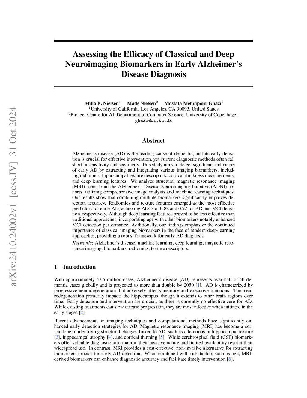 Alzheimer's disease (AD) is the leading cause of dementia, and its early detection is crucial for effective intervention, yet current diagnostic methods often fall short in sensitivity and specificity. This study aims to detect significant indicators of early AD by extracting and integrating various imaging biomarkers, including radiomics, hippocampal texture descriptors, cortical thickness measurements, and deep learning features. We analyze structural magnetic resonance imaging (MRI) scans from the Alzheimer's Disease Neuroimaging Initiative (ADNI) cohorts, utilizing comprehensive image analysis and machine learning techniques. Our results show that combining multiple biomarkers significantly improves detection accuracy. Radiomics and texture features emerged as the most effective predictors for early AD, achieving AUCs of 0.88 and 0.72 for AD and MCI detection, respectively. Although deep learning features proved to be less effective than traditional approaches, incorporating age with other biomarkers notably enhanced MCI detection performance. Additionally, our findings emphasize the continued importance of classical imaging biomarkers in the face of modern deep-learning approaches, providing a robust framework for early AD diagnosis.