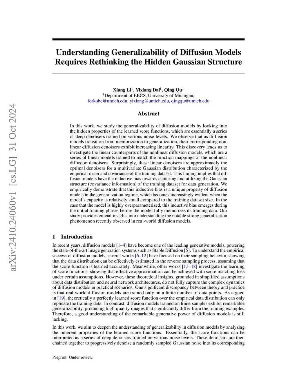 In this work, we study the generalizability of diffusion models by looking into the hidden properties of the learned score functions, which are essentially a series of deep denoisers trained on various noise levels. We observe that as diffusion models transition from memorization to generalization, their corresponding nonlinear diffusion denoisers exhibit increasing linearity. This discovery leads us to investigate the linear counterparts of the nonlinear diffusion models, which are a series of linear models trained to match the function mappings of the nonlinear diffusion denoisers. Surprisingly, these linear denoisers are approximately the optimal denoisers for a multivariate Gaussian distribution characterized by the empirical mean and covariance of the training dataset. This finding implies that diffusion models have the inductive bias towards capturing and utilizing the Gaussian structure (covariance information) of the training dataset for data generation. We empirically demonstrate that this inductive bias is a unique property of diffusion models in the generalization regime, which becomes increasingly evident when the model's capacity is relatively small compared to the training dataset size. In the case that the model is highly overparameterized, this inductive bias emerges during the initial training phases before the model fully memorizes its training data. Our study provides crucial insights into understanding the notable strong generalization phenomenon recently observed in real-world diffusion models.