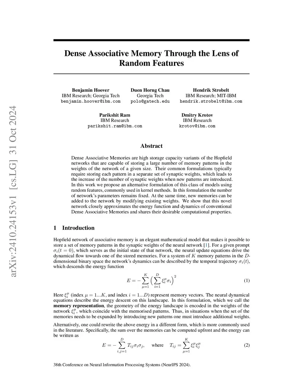 Dense Associative Memories are high storage capacity variants of the Hopfield networks that are capable of storing a large number of memory patterns in the weights of the network of a given size. Their common formulations typically require storing each pattern in a separate set of synaptic weights, which leads to the increase of the number of synaptic weights when new patterns are introduced. In this work we propose an alternative formulation of this class of models using random features, commonly used in kernel methods. In this formulation the number of network's parameters remains fixed. At the same time, new memories can be added to the network by modifying existing weights. We show that this novel network closely approximates the energy function and dynamics of conventional Dense Associative Memories and shares their desirable computational properties.