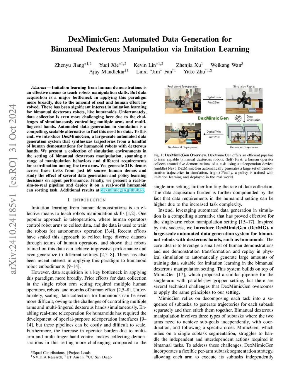 DexMimicGen: Automated Data Generation for Bimanual Dexterous Manipulation via Imitation Learning