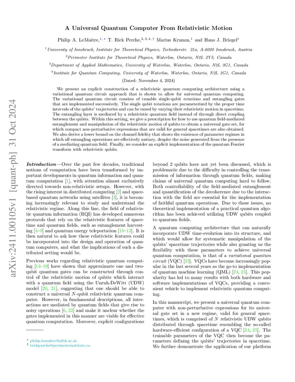 A Universal Quantum Computer From Relativistic Motion