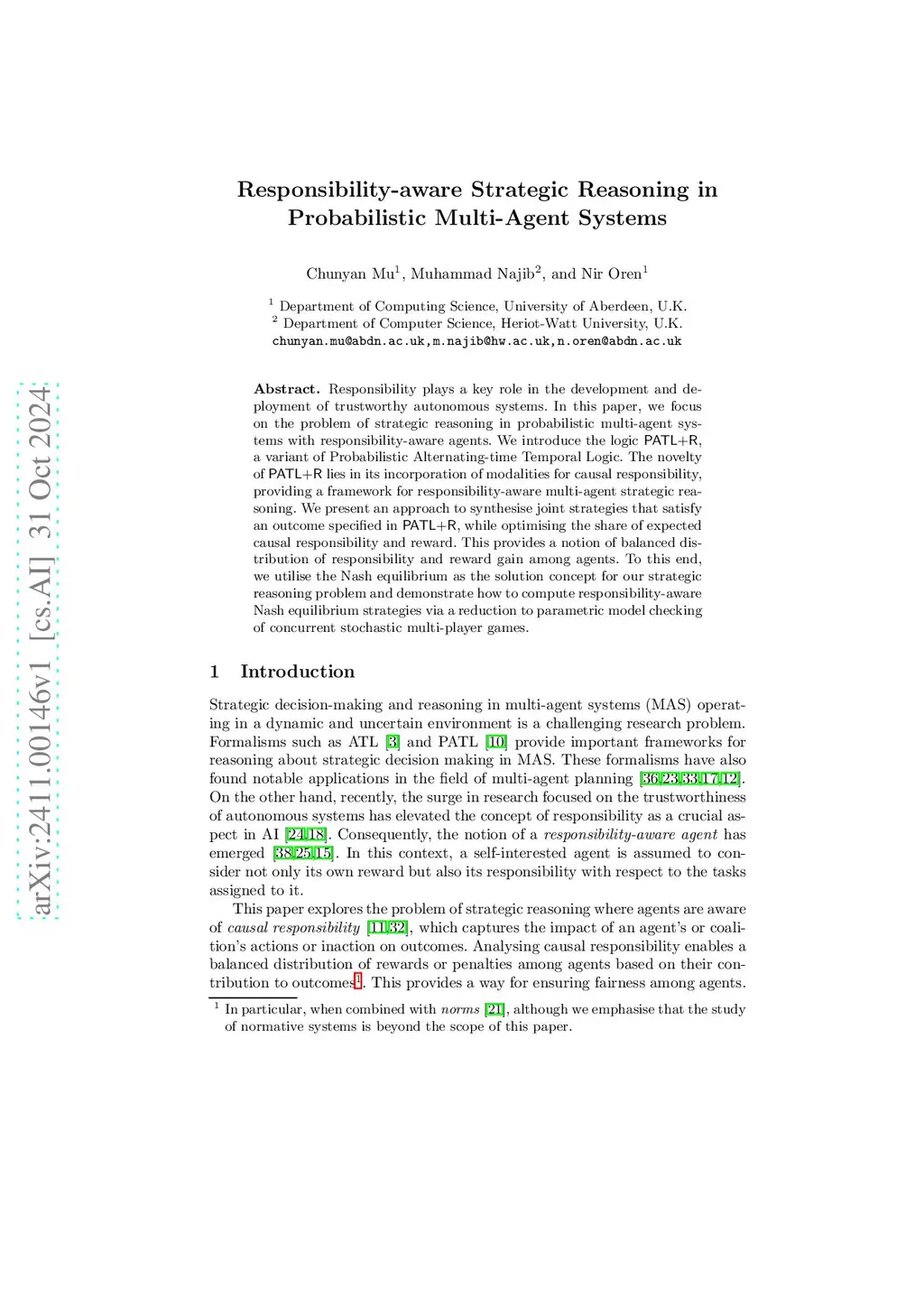 Responsibility plays a key role in the development and deployment of trustworthy autonomous systems. In this paper, we focus on the problem of strategic reasoning in probabilistic multi-agent systems with responsibility-aware agents. We introduce the logic PATL+R, a variant of Probabilistic Alternating-time Temporal Logic. The novelty of PATL+R lies in its incorporation of modalities for causal responsibility, providing a framework for responsibility-aware multi-agent strategic reasoning. We present an approach to synthesise joint strategies that satisfy an outcome specified in PATL+R, while optimising the share of expected causal responsibility and reward. This provides a notion of balanced distribution of responsibility and reward gain among agents. To this end, we utilise the Nash equilibrium as the solution concept for our strategic reasoning problem and demonstrate how to compute responsibility-aware Nash equilibrium strategies via a reduction to parametric model checking of concurrent stochastic multi-player games.