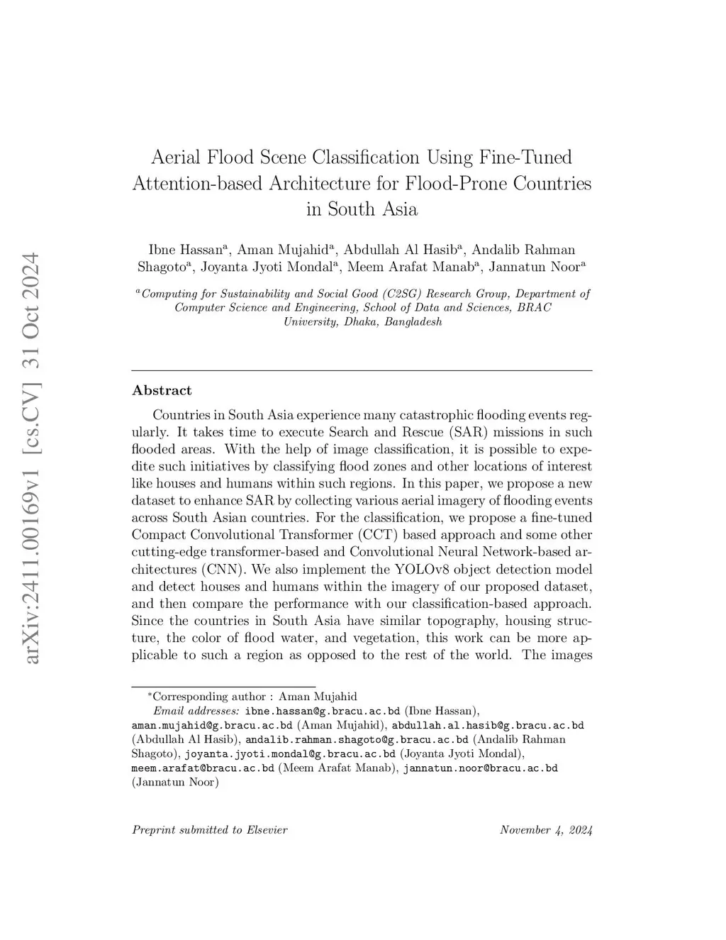 Countries in South Asia experience many catastrophic flooding events regularly. Through image classification, it is possible to expedite search and rescue initiatives by classifying flood zones, including houses and humans. We create a new dataset collecting aerial imagery of flooding events across South Asian countries. For the classification, we propose a fine-tuned Compact Convolutional Transformer (CCT) based approach and some other cutting-edge transformer-based and Convolutional Neural Network-based architectures (CNN). We also implement the YOLOv8 object detection model and detect houses and humans within the imagery of our proposed dataset, and then compare the performance with our classification-based approach. Since the countries in South Asia have similar topography, housing structure, the color of flood water, and vegetation, this work can be more applicable to such a region as opposed to the rest of the world. The images are divided evenly into four classes: 'flood', 'flood with domicile', 'flood with humans', and ño flood'. After experimenting with our proposed dataset on our fine-tuned CCT model, which has a comparatively lower number of weight parameters than many other transformer-based architectures designed for computer vision, it exhibits an accuracy and macro average precision of 98.62% and 98.50%. The other transformer-based architectures that we implement are the Vision Transformer (ViT), Swin Transformer, and External Attention Transformer (EANet), which give an accuracy of 88.66%, 84.74%, and 66.56% respectively. We also implement DCECNN (Deep Custom Ensembled Convolutional Neural Network), which is a custom ensemble model that we create by combining MobileNet, InceptionV3, and EfficientNetB0, and we obtain an accuracy of 98.78%. The architectures we implement are fine-tuned to achieve optimal performance on our dataset.