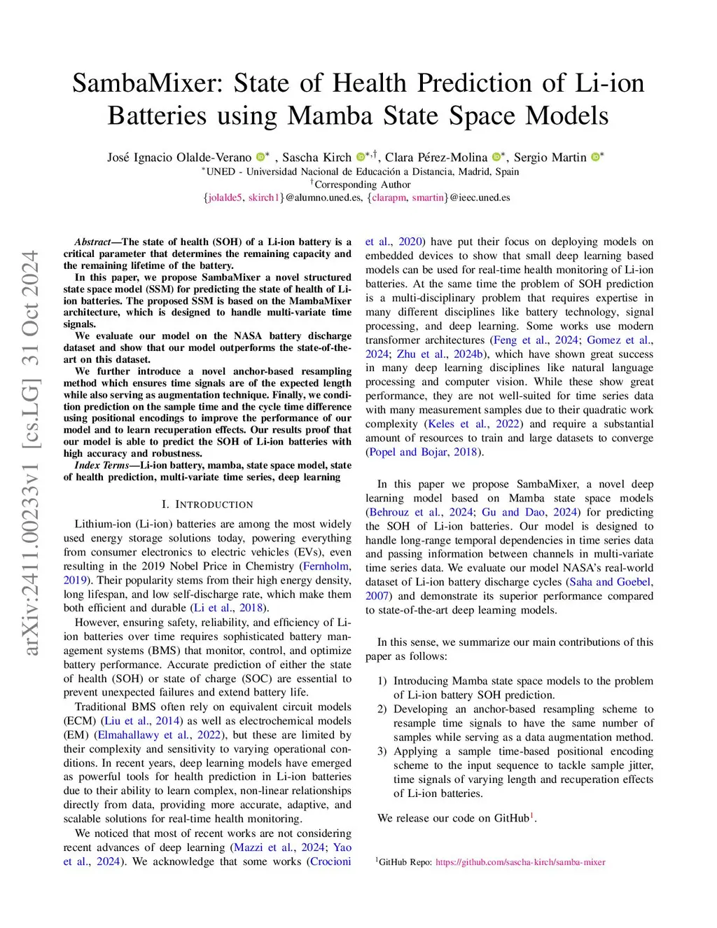 The state of health (SOH) of a Li-ion battery is a critical parameter that determines the remaining capacity and the remaining lifetime of the battery. In this paper, we propose SambaMixer a novel structured state space model (SSM) for predicting the state of health of Li-ion batteries. The proposed SSM is based on the MambaMixer architecture, which is designed to handle multi-variate time signals. We evaluate our model on the NASA battery discharge dataset and show that our model outperforms the state-of-the-art on this dataset. We further introduce a novel anchor-based resampling method which ensures time signals are of the expected length while also serving as augmentation technique. Finally, we condition prediction on the sample time and the cycle time difference using positional encodings to improve the performance of our model and to learn recuperation effects. Our results proof that our model is able to predict the SOH of Li-ion batteries with high accuracy and robustness.