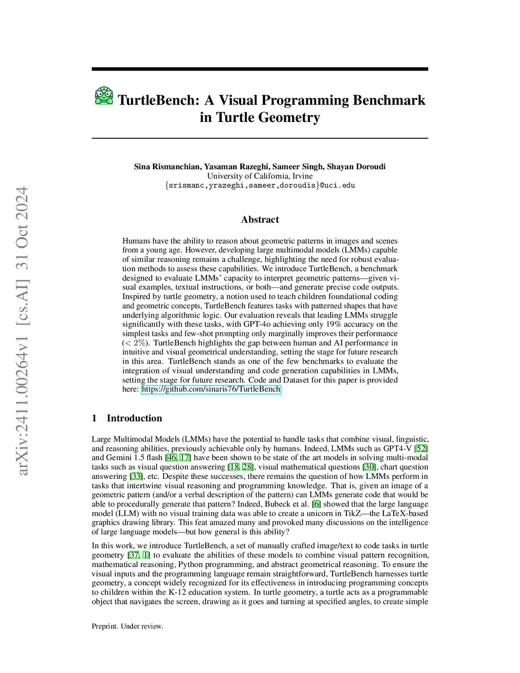 Humans have the ability to reason about geometric patterns in images and scenes from a young age. However, developing large multimodal models (LMMs) capable of similar reasoning remains a challenge, highlighting the need for robust evaluation methods to assess these capabilities. We introduce \Turtle, a benchmark designed to evaluate LMMs' capacity to interpret geometric patterns -- given visual examples, textual instructions, or both -- and generate precise code outputs. Inspired by turtle geometry, a notion used to teach children foundational coding and geometric concepts, TurtleBench features tasks with patterned shapes that have underlying algorithmic logic. Our evaluation reveals that leading LMMs struggle significantly with these tasks, with GPT-4o achieving only 19\% accuracy on the simplest tasks and few-shot prompting only marginally improves their performance (). \Turtle highlights the gap between human and AI performance in intuitive and visual geometrical understanding, setting the stage for future research in this area. \Turtle stands as one of the few benchmarks to evaluate the integration of visual understanding and code generation capabilities in LMMs, setting the stage for future research. Code and Dataset for this paper is provided here: \href{this https URL}{this https URL}