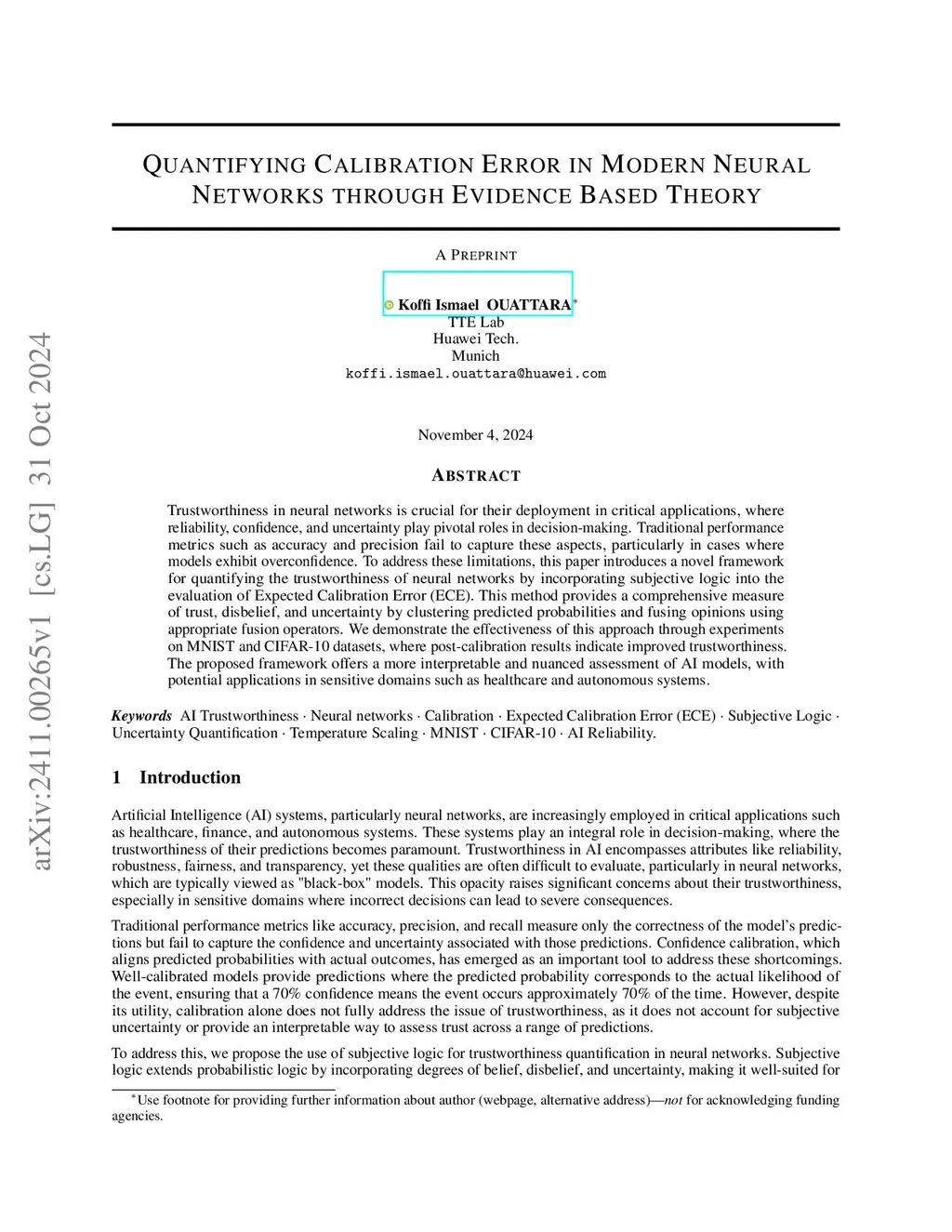 Trustworthiness in neural networks is crucial for their deployment in critical applications, where reliability, confidence, and uncertainty play pivotal roles in decision-making. Traditional performance metrics such as accuracy and precision fail to capture these aspects, particularly in cases where models exhibit overconfidence. To address these limitations, this paper introduces a novel framework for quantifying the trustworthiness of neural networks by incorporating subjective logic into the evaluation of Expected Calibration Error (ECE). This method provides a comprehensive measure of trust, disbelief, and uncertainty by clustering predicted probabilities and fusing opinions using appropriate fusion operators. We demonstrate the effectiveness of this approach through experiments on MNIST and CIFAR-10 datasets, where post-calibration results indicate improved trustworthiness. The proposed framework offers a more interpretable and nuanced assessment of AI models, with potential applications in sensitive domains such as healthcare and autonomous systems.